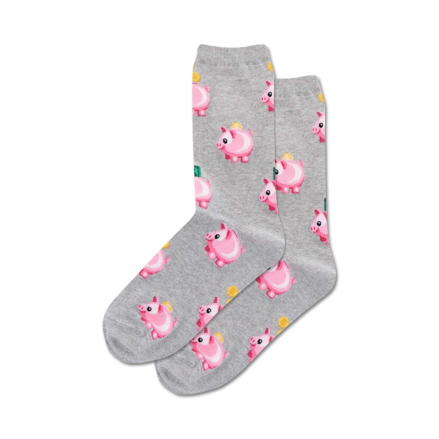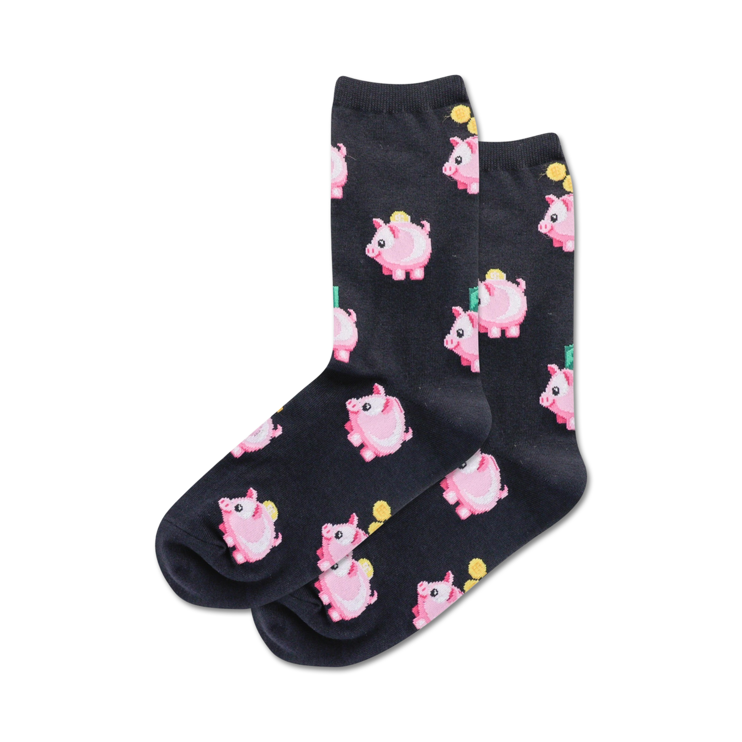 Piggy Bank Pix Perfect Socks: These pink piggy bank-patterned socks are as cute as your childhood piggy bank! Our crew length socks are knit with fine fibers to fit women's feet perfectly. Made with a blend of nylon, polyester, cotton, spandex and rubber. Sock care: machine wash and tumble dry low.
