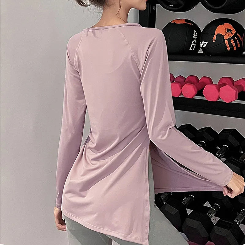 Effortlessly stylish and functional, our Pleated Side Slit Long Sleeve Sports Shirt for Women is perfect for active women. The pleated design adds a touch of elegance, while the side slits ensure a comfortable fit and easy movement. Stay comfortable and fashionable during your workouts with this must-have shirt.