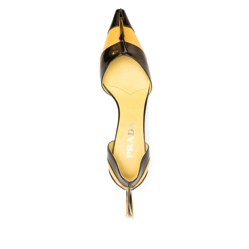 chocolate brown pointed toe branded leather insole low heel stripe detailing