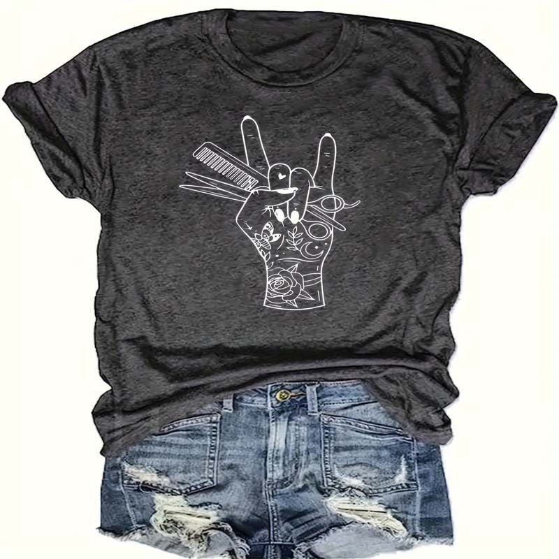 Women's Hand & Floral Print Crew Neck T-Shirt - Bohemian Chic Summer Essential