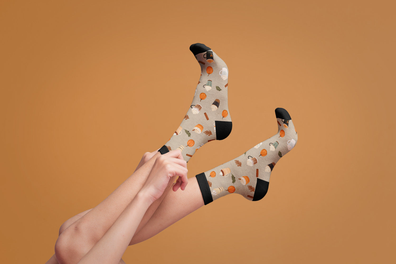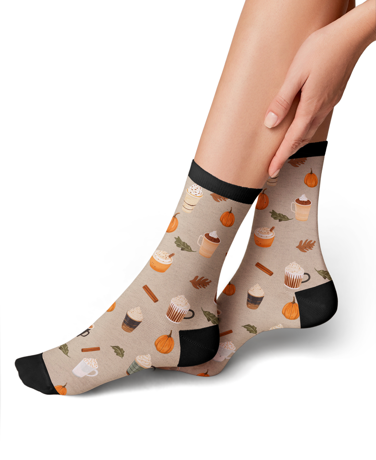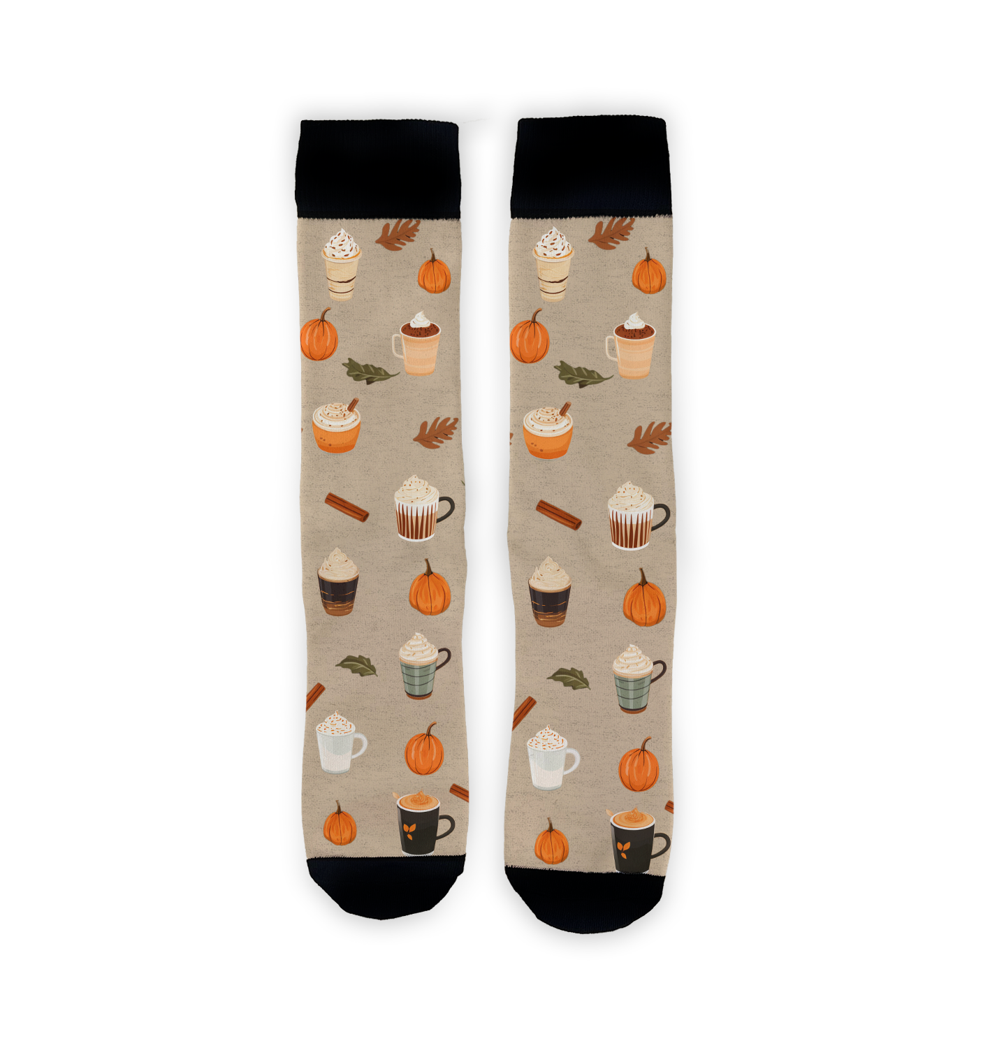 Savor the flavors of fall in these Pumpkin Spice Latte socks! Slip 'em on and let your feet soak in the warmth of autumn while sipping your favorite pumpkin spice cup of joe. This crew sock set's got it all: pumpkins, coffee cups, cinnamon sticks, and fall leaves in bright colors on a beige background. The black top adds a stylish touch. Put on a pair of these unisex Pumpkin Spice Latte socks and step into a cozy autumn wonderland.