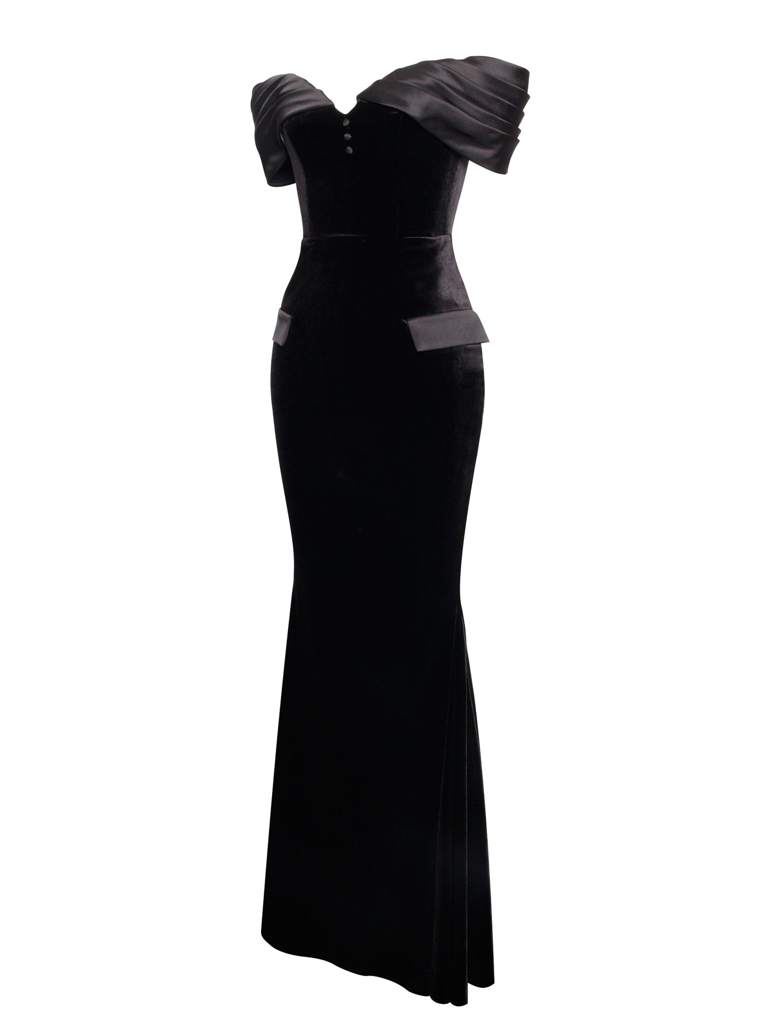 Introducing the Qamra Dress, a stunning blend of elegance and drama crafted from luxurious black velvet and black satin. This mermaid maxi dress features rouched off-shoulder sleeves that exude timeless sophistication. The high waist and built-in corset create a beautifully sculpted silhouette, while satin-covered buttons and pocket cap decorations add refined details. An invisible zipper ensures a flawless fit, making the Qamra Dress the ultimate choice for those seeking a captivating and glamorous look.