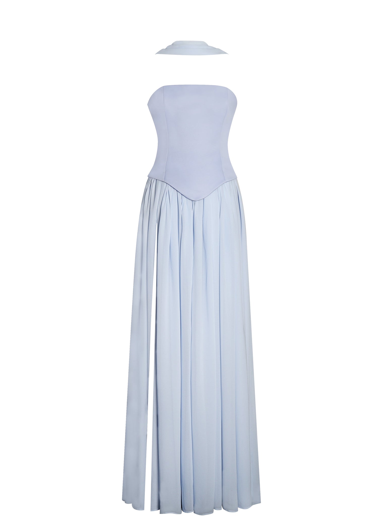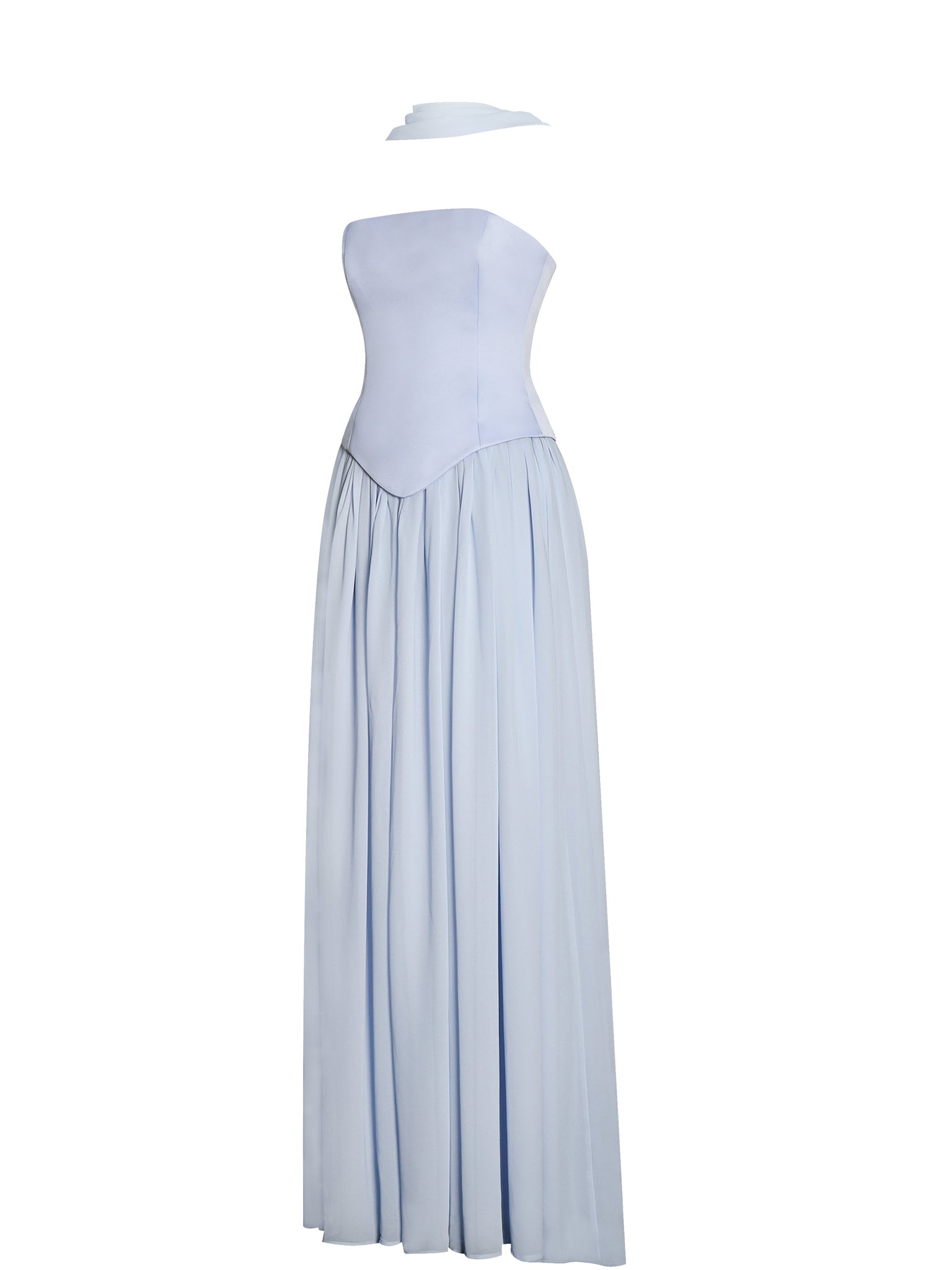 Designed for timeless elegance, the Qianna Dress is the perfect choice for weddings, engagements, formal events, summer soirées, and birthday celebrations. This breathtaking gown features a strapless peplum top with built-in bones and non-slip straps, ensuring a secure and flattering fit. The lace-up back adds a romantic touch, while the double-layered chiffon skirt flows effortlessly with every step. A high slit adds just the right amount of drama, making it perfect for dancing the night away. The dress is fully lined with an invisible zipper for a seamless finish. To complete the look, a matching chiffon scarf is included, adding an extra layer of sophistication to this dreamy ensemble.