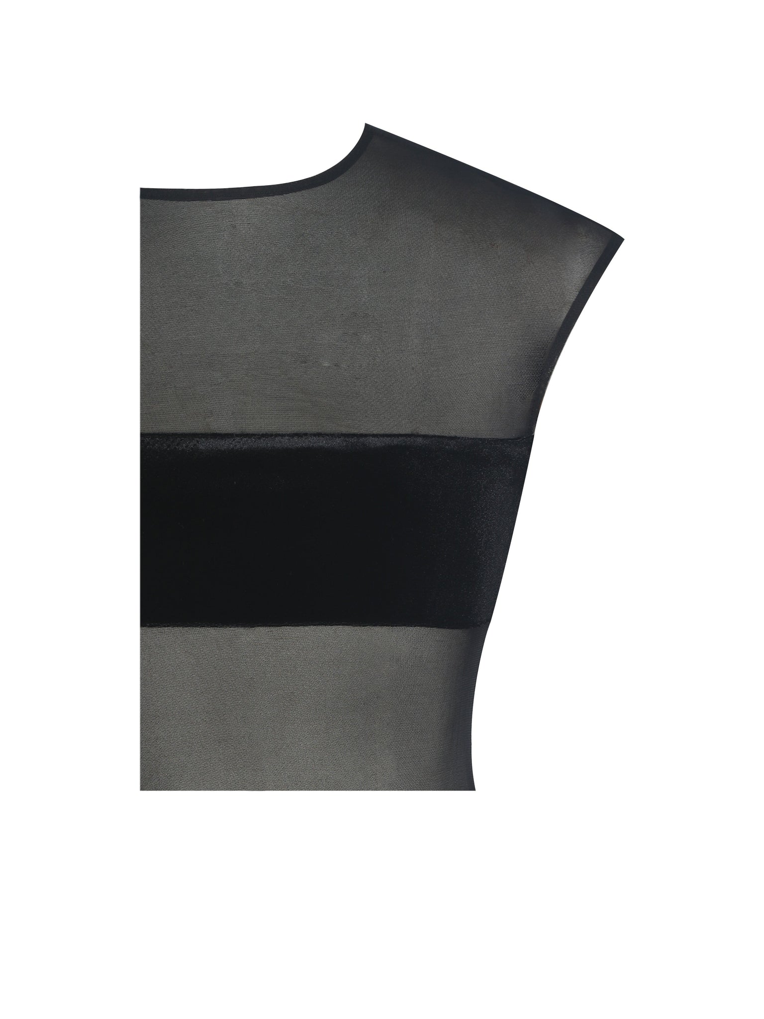 Slip into the Quielle Dress, a sultry blend of romance and allure crafted for nights when the mood runs deep. Its sheer black mesh bodice pairs effortlessly with a velvet midi-length skirt, creating a contrast that feels both ethereal and irresistibly sensual. The round neckline keeps the look refined, while the body-hugging silhouette and back vent offer graceful movement. Finished with an invisible back zipper for a clean, seamless fit, this dress is perfect for Valentine’s dates, late-night cocktails, or any moment you want to feel unforgettable in velvet and shadow.