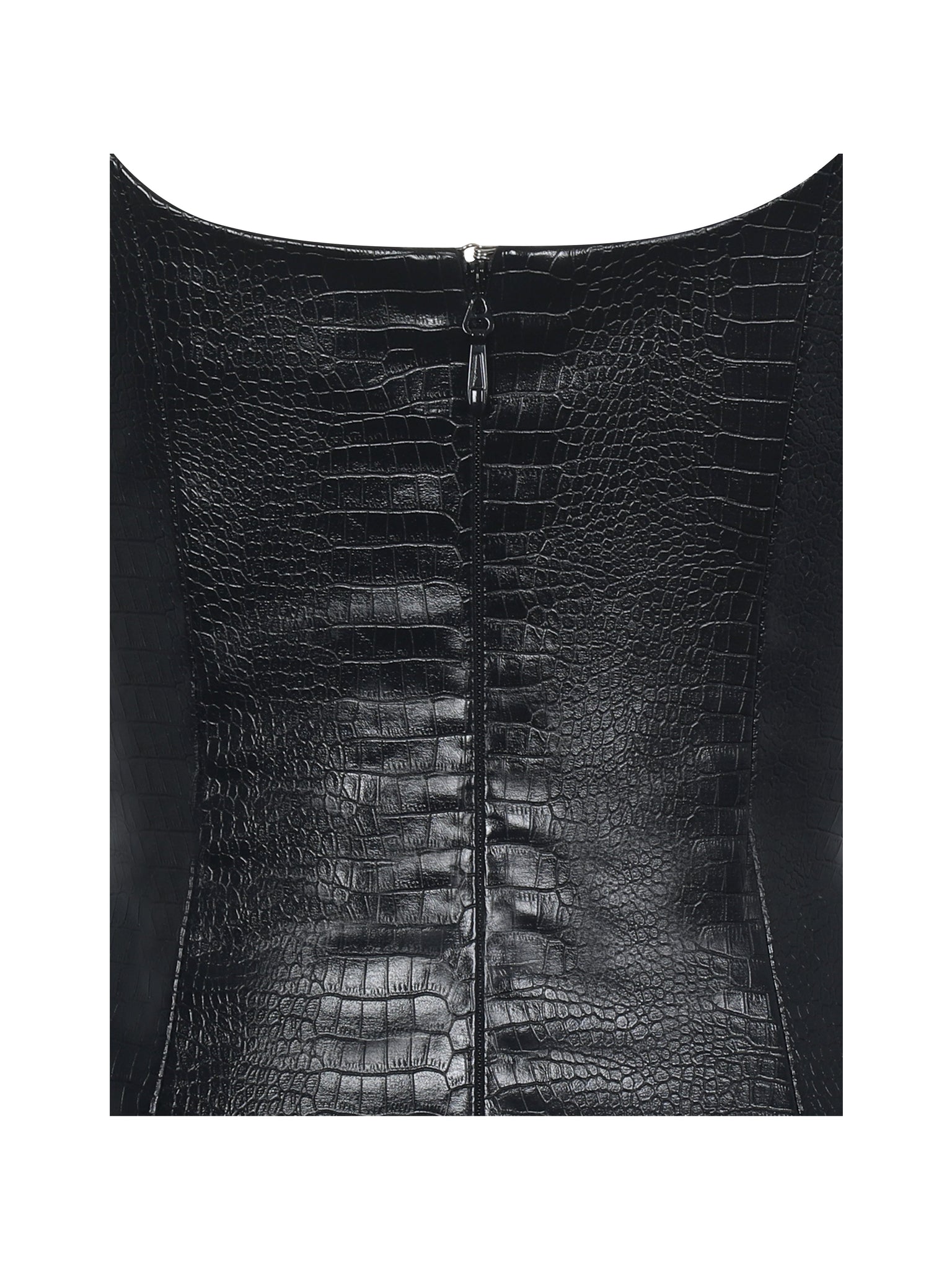 Command the night in the Quilia Dress, a sleek black mini cut from supple vegan crocodile leather. Its plunging V-neckline and wide straps frame the neckline, while princess seams contour the body for a sculpted, second-skin fit. A hint of pleating at the bust adds a flirtatious note, balanced by the dress’s unapologetically bold texture. Fully lined in smooth satin, it’s finished with an invisible back zipper for a seamless silhouette. Whether paired with stilettos for rooftop cocktails or boots for a late-night edge, the Quilia Dress is your ticket to turning every sidewalk into a runway.