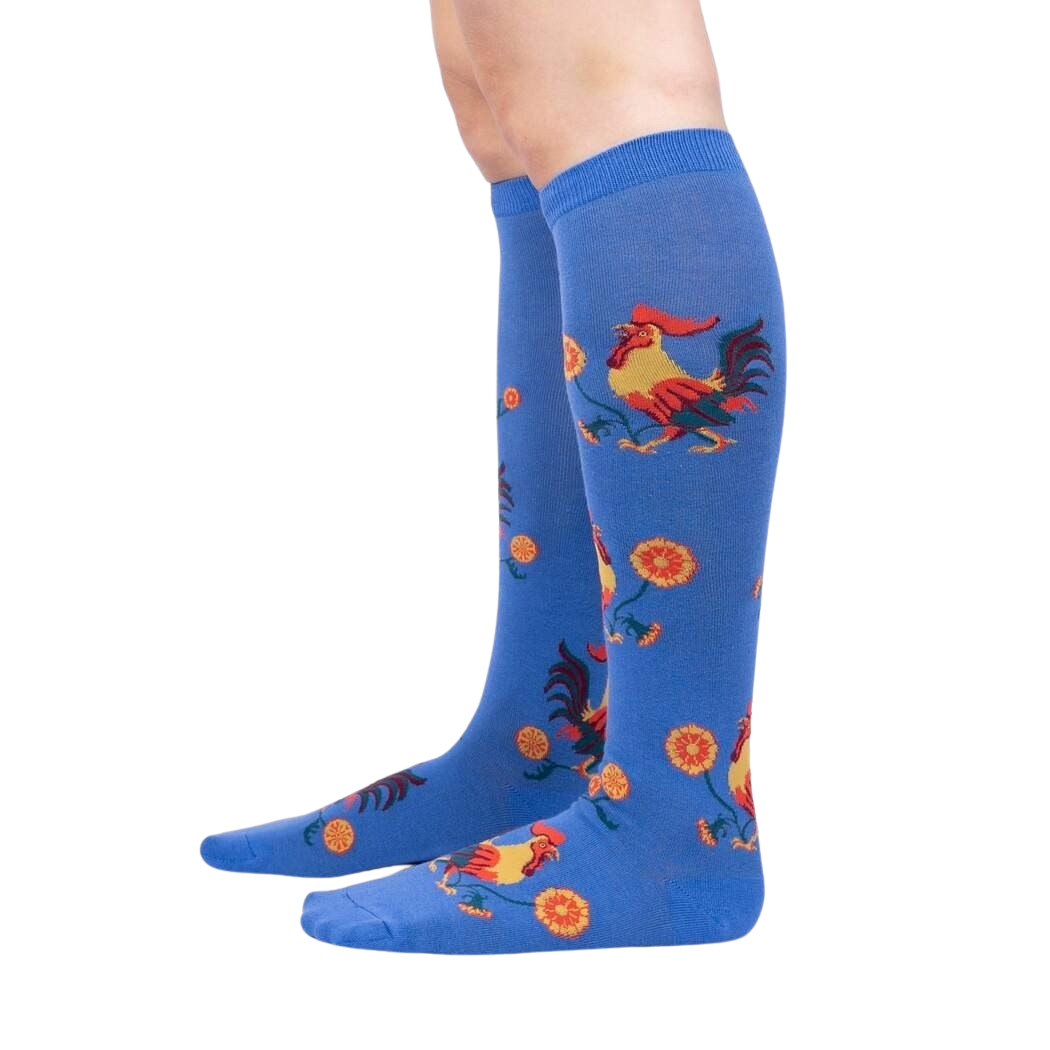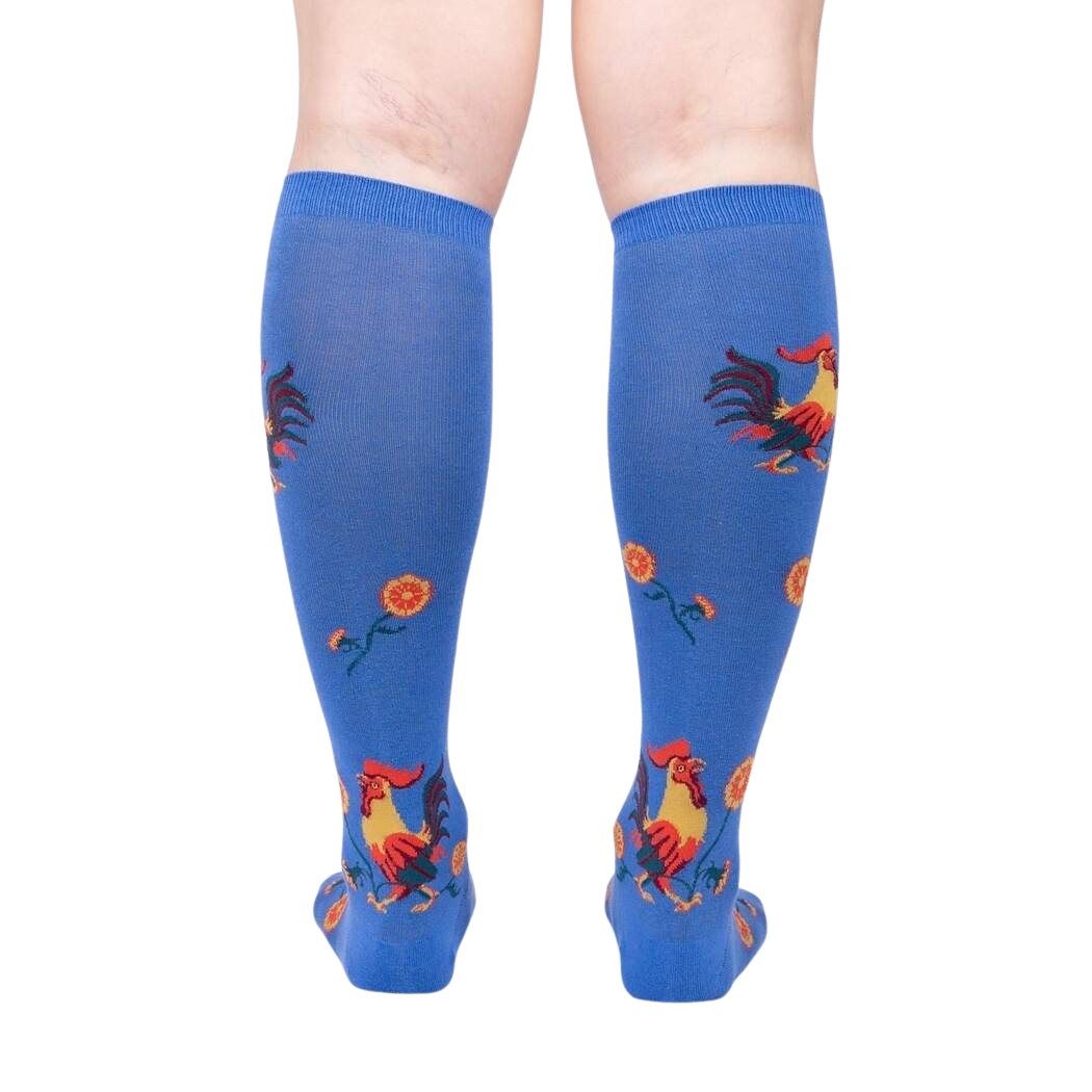 Kickstart your day with a smile and strut your stuff in these Rise and Shine socks! Featuring a cheerful pattern of red and orange roosters strutting in front of vibrant yellow sunflowers against a crisp blue backdrop, these knee-high socks for women will add a touch of fun and energy to your everyday style. Perfect for the office, a casual day out, or even a night on the town. Let these rooster socks be your daily reminder to rise and shine, no matter what the day brings.