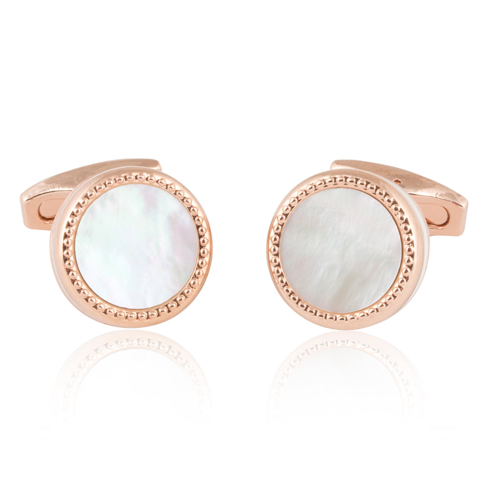 A classic stud set with cufflinks in rose gold and mother of pearl is daunting to find these days due to the popularity of rose gold. This formal set features a rich rose gold coating with a nice bead accent on the cufflinks and studs. Authentic mother of pearl is used in the design to keep the groomsmen looking fantastic. We carry this item with onyx too if interested. These cufflinks arrive in a handsome gift box like all of our designs.
