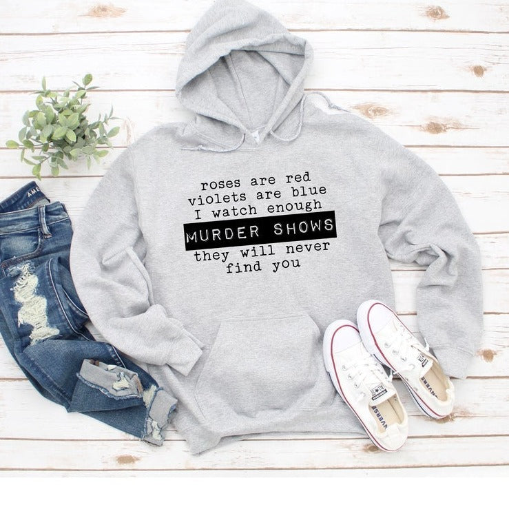 Crime show fans this one's for you! This light gray sponge fleece sweatshirt features the saying "Roses Are Red, Violets Are Blue, I watch enough murder shows, they will never find you" in black text.
