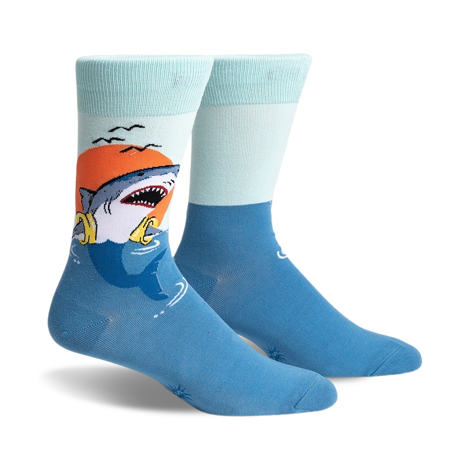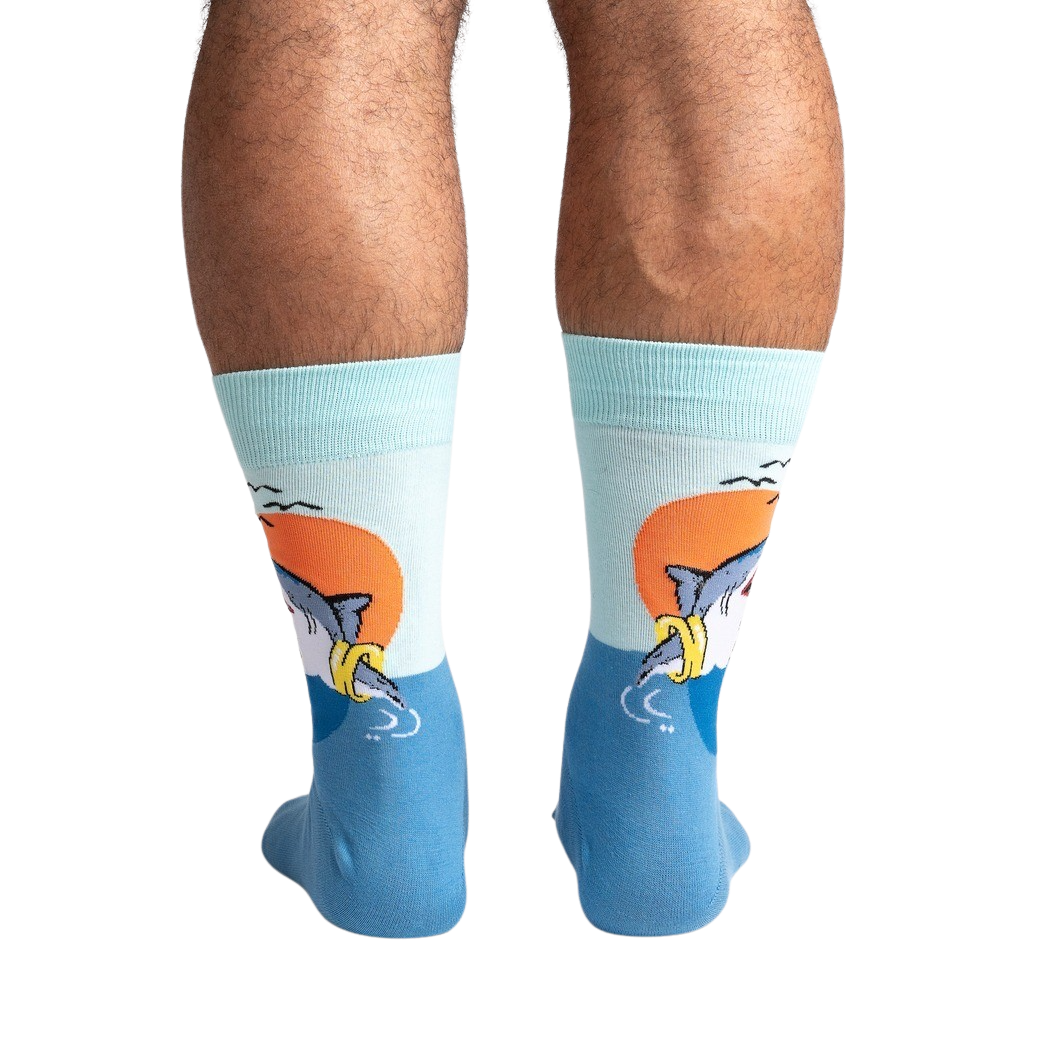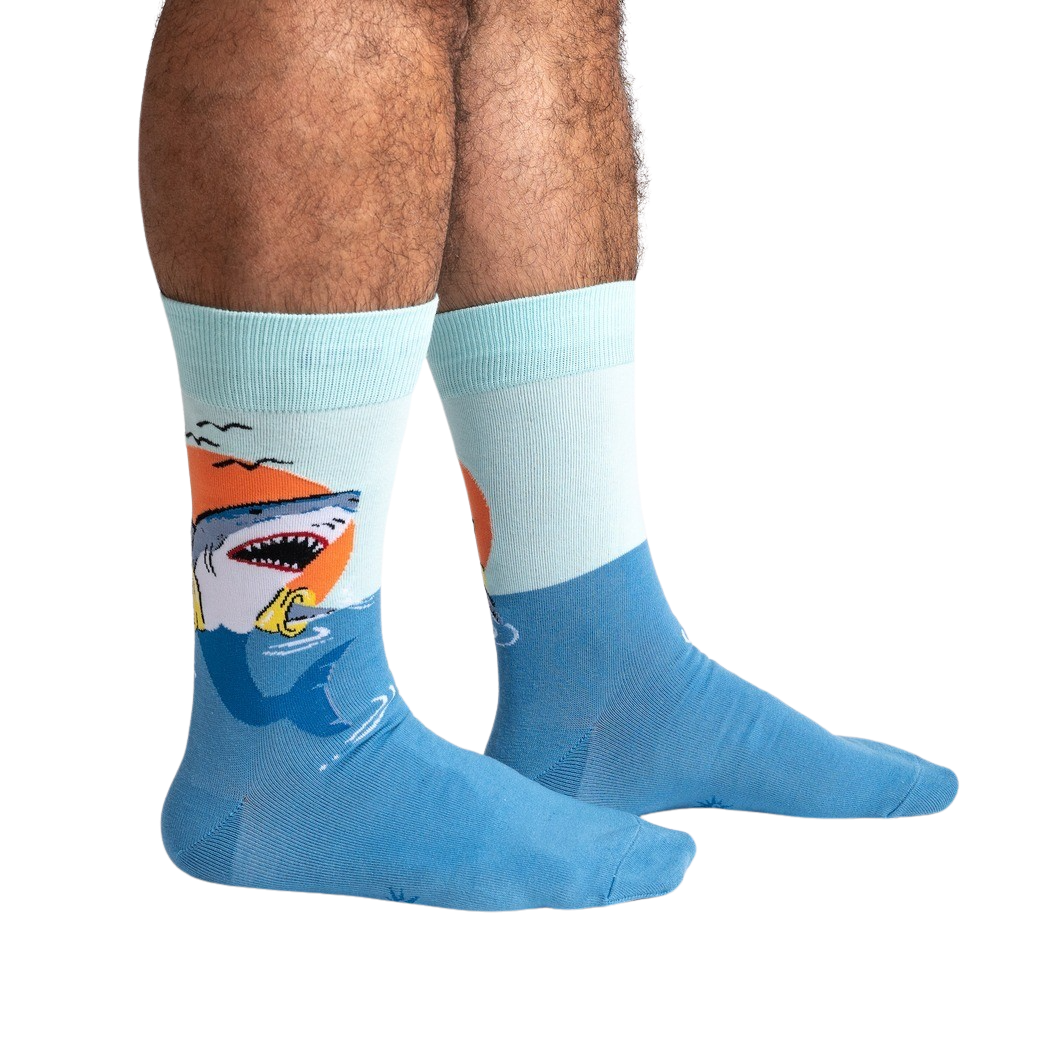 You'll be swimming in compliments wearing these slick S. O. S. socks. Blue water, a glorious sunset, a shark sporting a life preserver in his mouth, what more could you ask for? They'll remind you that even when life's got you treading water, you can still keep your head above the waves in style. Perfect for the beach, a dock, or a shark-tank meeting. Onlookers might just feel compelled to wave.