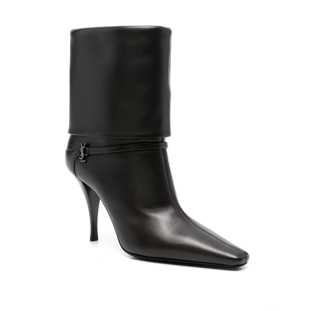 coffee brown calf leather smooth grain folded design slip-on style 85mm high stiletto heel strap detailing appliqué logo square toe branded leather insole leather sole ankle-length