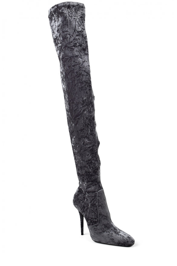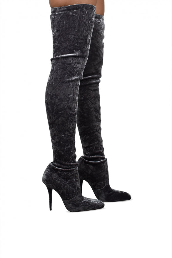 Saint Laurent Talia grey velvet thigh-high boots.Almond toe.11 cm stiletto heel.Leather sole.Made in Italy.