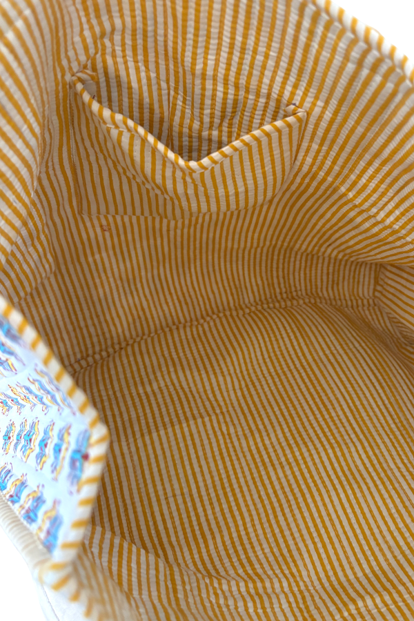 Bring a little sunshine into crisp autumn days with this cheerful floral tote bag! 🍂✨ Featuring a charming block-print inspired pattern in golden yellow and soft blue, this bag feels both timeless and seasonal. The striped trim and handles add a playful detail, making it a standout piece you’ll reach for again and again.