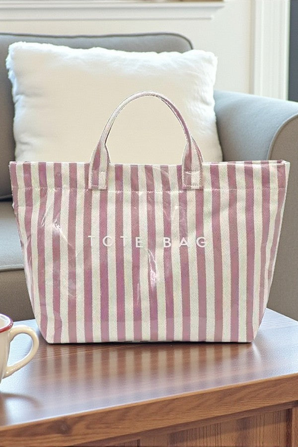 Brighten up your accessory collection with our Pink and White Striped Glossy Tote. Featuring a classic vertical stripe pattern and a sleek, high-shine finish, this bag offers a fresh, contemporary take on a timeless design. The minimalist "TOTE BAG" typography adds an edgy, high-fashion touch that pairs perfectly with any casual look.