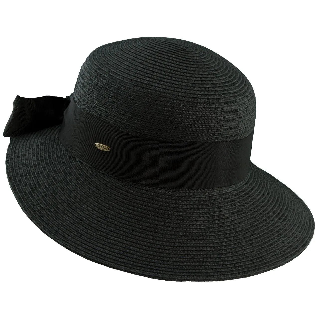 • Wide ribbon hatband Riviera is one of Scala by Dorfman Pacific's best sellers, and there's no question as to why. Features include a paper braid round crown with dimensional 3 3/4" brim, grosgain band with a large bow tied on the back, and elasticized COOLMAX sweatband. One size fits most. Available in navy. Navy looks the same as black, except with a navy hatband.