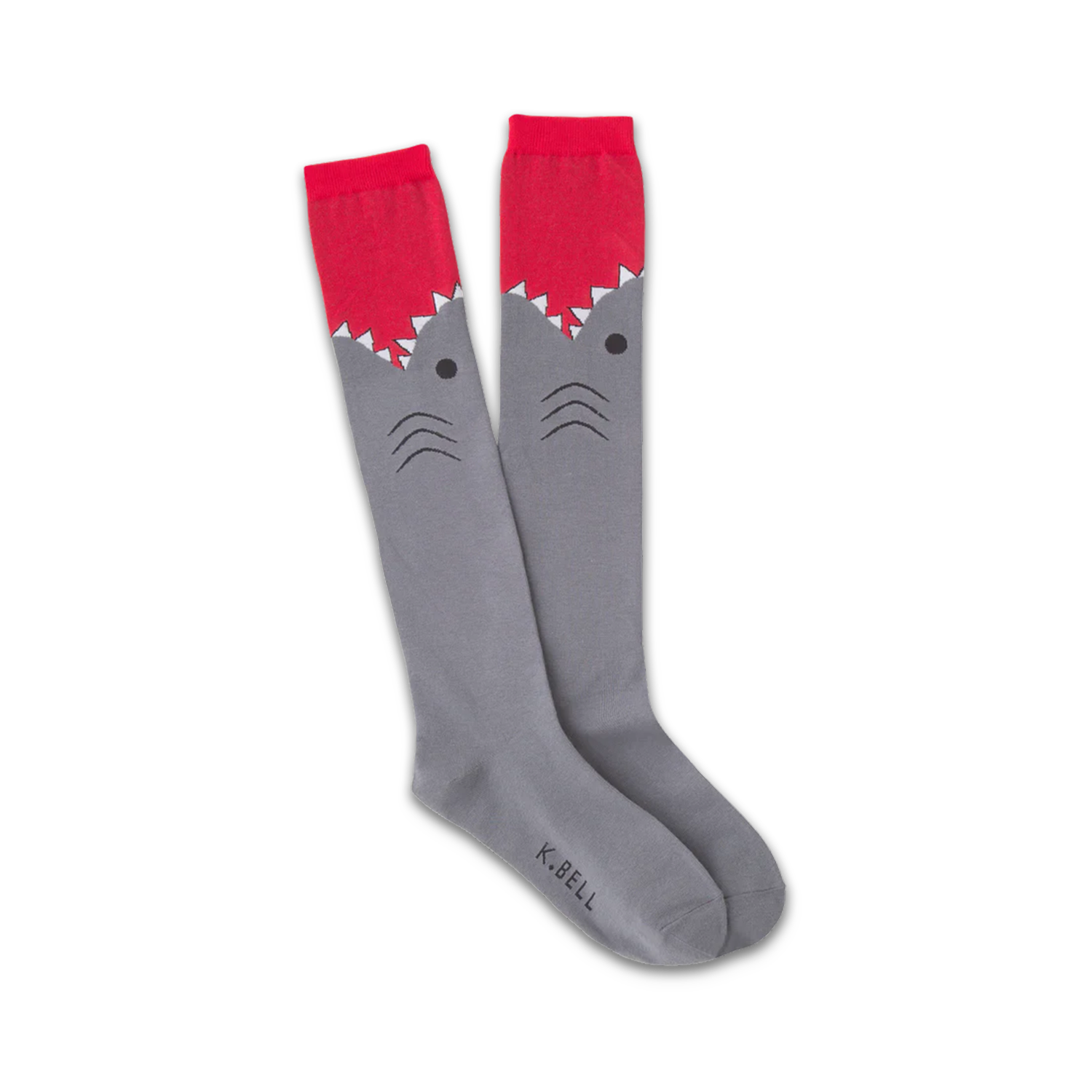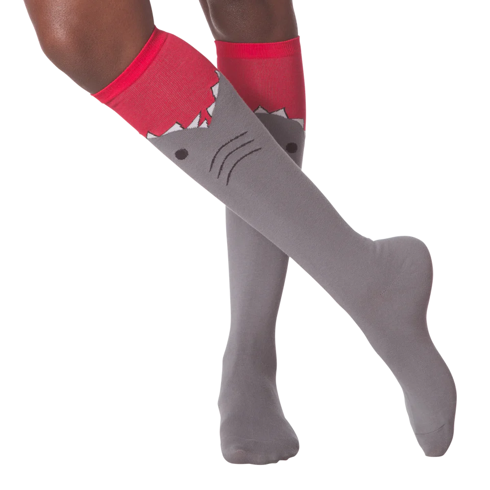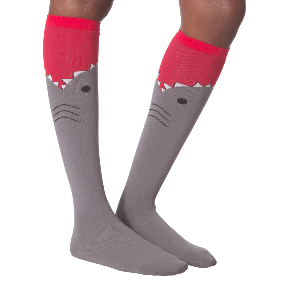 Take a large bite out of fashion and show off your love for the most feared beast of the sea! This pair of gray and red knee high socks features a large shark biting up the calf detailed with gills and teeth. No fishy person would dare cross you wearing these ferocious socks!
