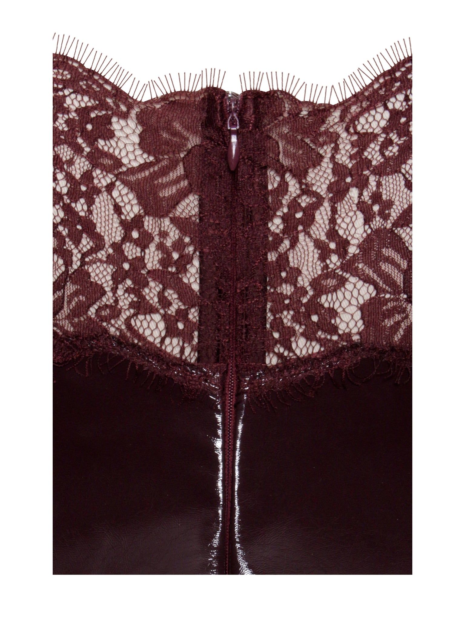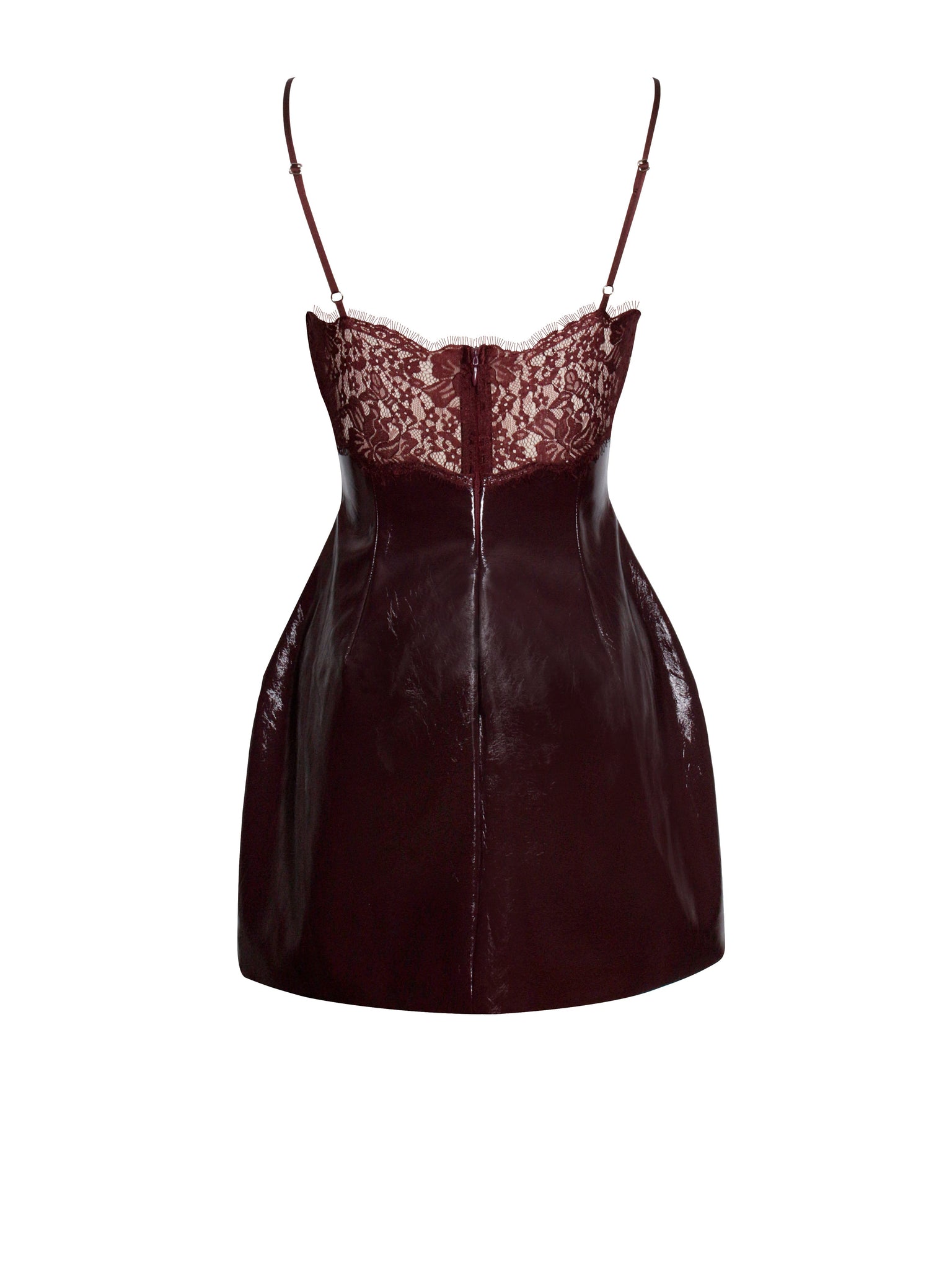 Say hello to our newest Shelby, a stunning leather and lace mini that seamlessly blends sophistication with an edgy allure. Crafted from cruelty-free faux vegan leather, the a-line mini skirt and intricately scalloped lace bust panel create a chic silhouette. Fully lined with satin, featuring an invisible zipper at the center back and adjustable thin satin straps, this dress ensures the perfect fit. Ideal for dinner parties, nights out, or any special occasion, it exudes timeless elegance. Elevate your style with this versatile and glamorous wardrobe essential.