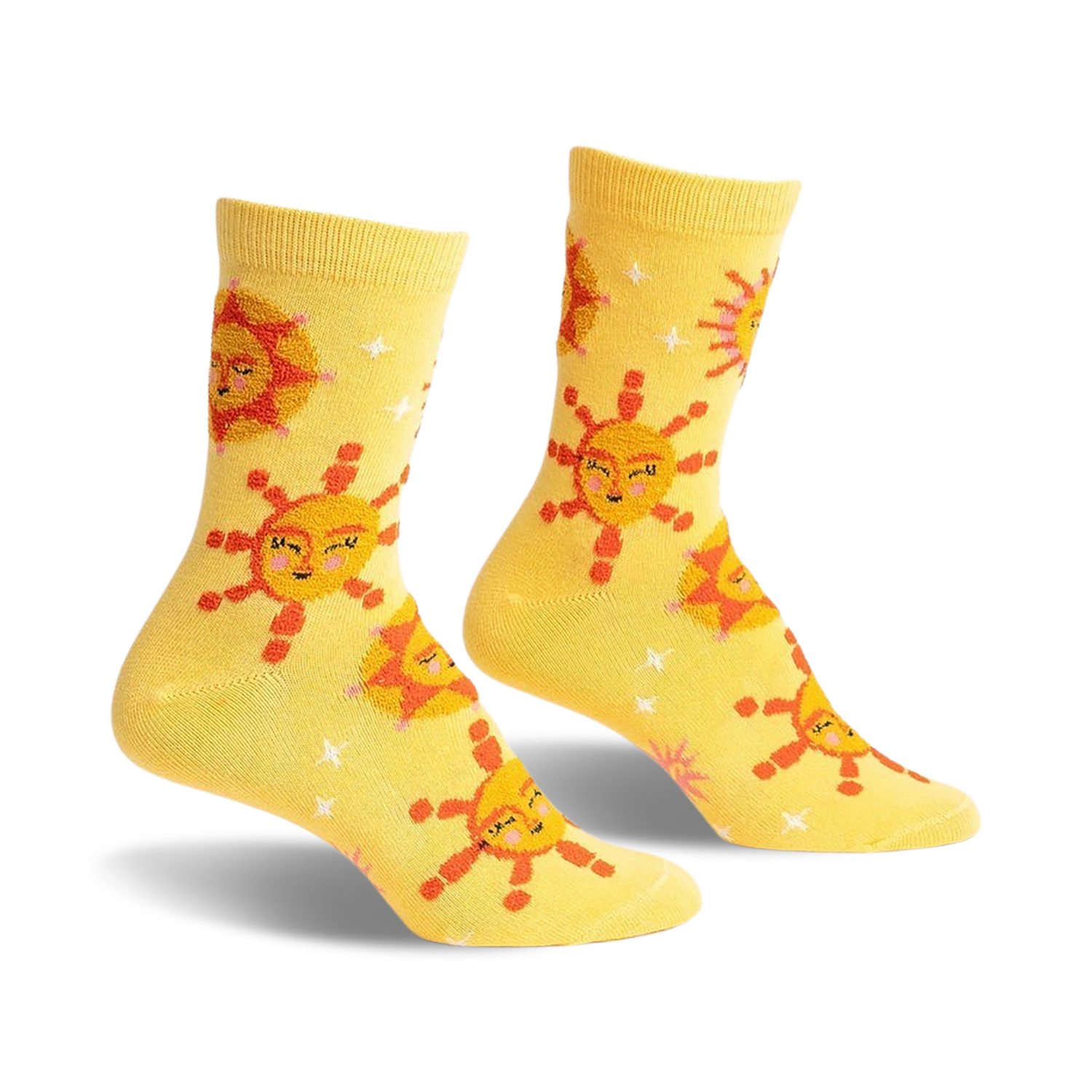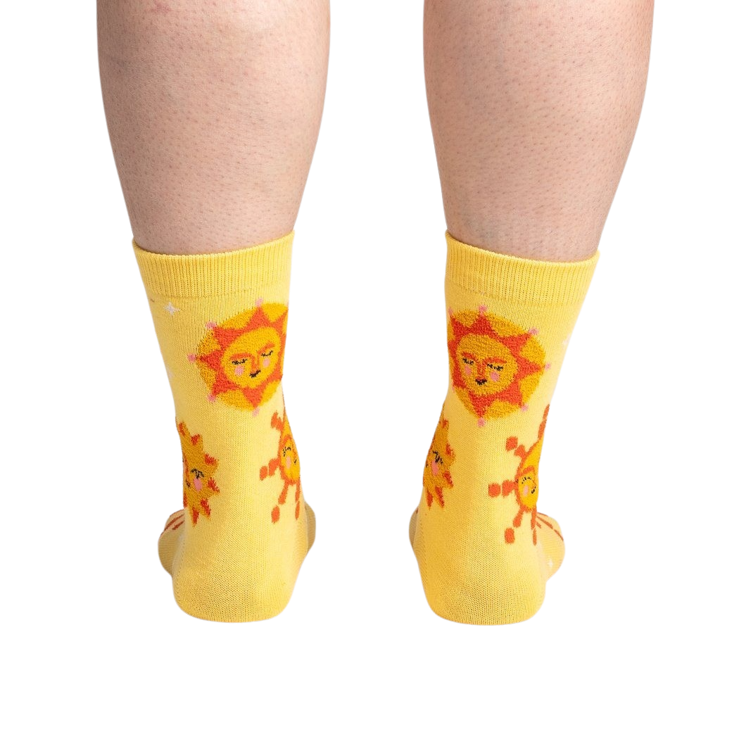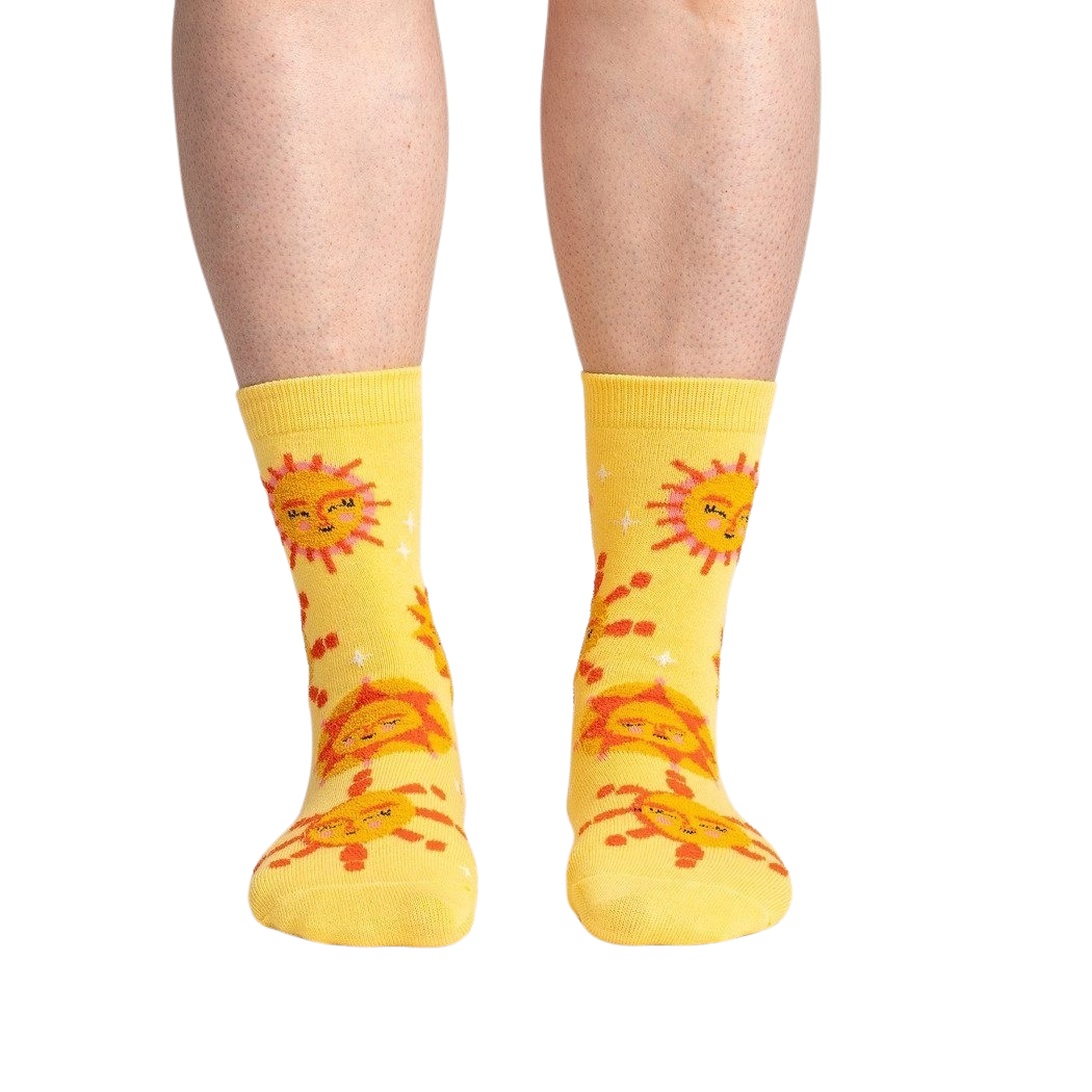 Shine bright like the sun with these cheerful and vibrant crew socks for women. Featuring a sunny yellow design dotted with orange suns sporting smiley faces, these socks will remind you to embrace your inner sunshine and spread joy wherever you go.