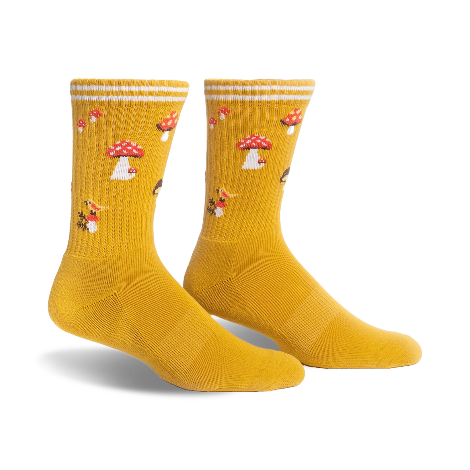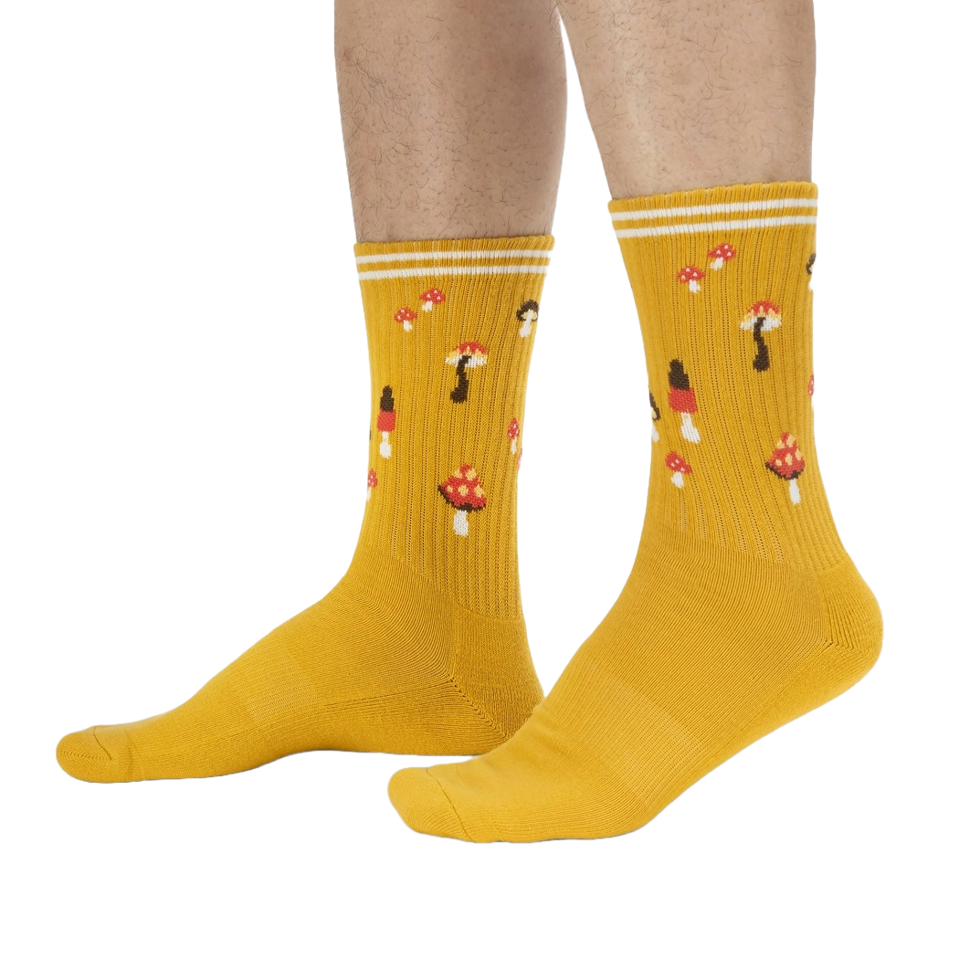 Wanderlust warriors, mycologists in training, and gnome enthusiasts - behold these crew socks, your new favorite for fungus fun! With vividly red and white mushroom caps nestling among vibrant blue forest friends amongst a sunflower yellow backdrop, these wild socks really make a spore. Plus, we've blessed each pair with a dash of durability and comfort. Not that you'll ever want to take them off, anyway. One size fits most.