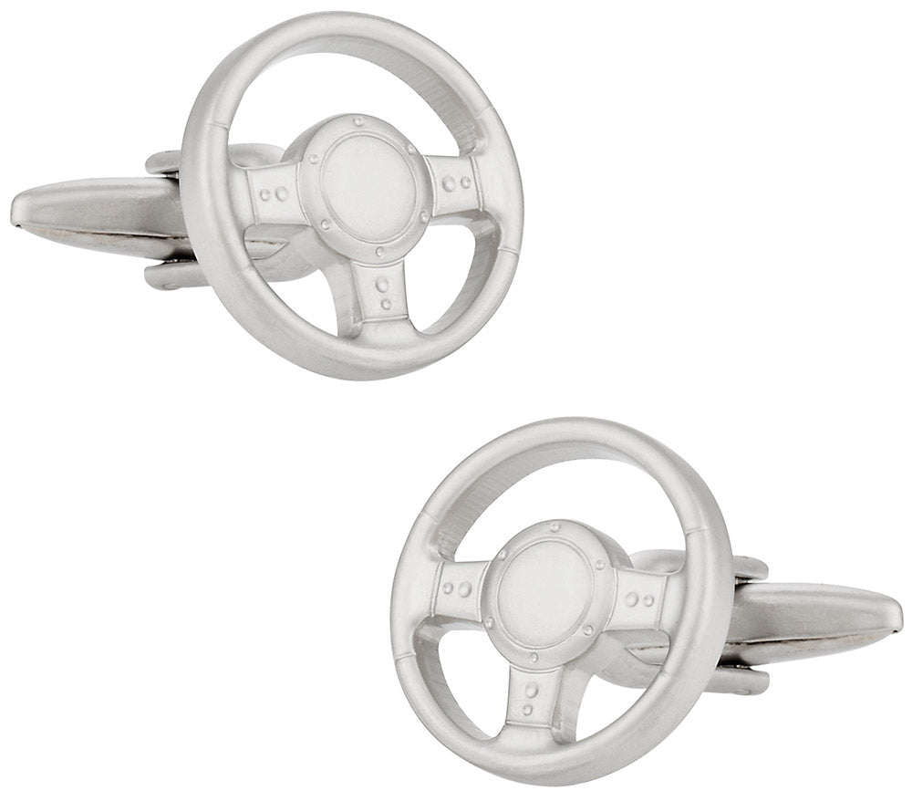 You can give mass produced cufflinks and watch the recipient roll her eyes or go first class by ordering handcrafted cufflinks designed by the experts at Cuff Daddy. Steering Wheel Cufflinks represent the typical unique design that you expect from our artisans. A made to scale steering wheel attaches to a sleek looking rhodium silver mount. Give these cufflinks to car buffs in your family or racing fans that talk nonstop about NASCAR at work. We brush each cufflink with a matte finish to enhance the glow that reflects both natural and artificial light.