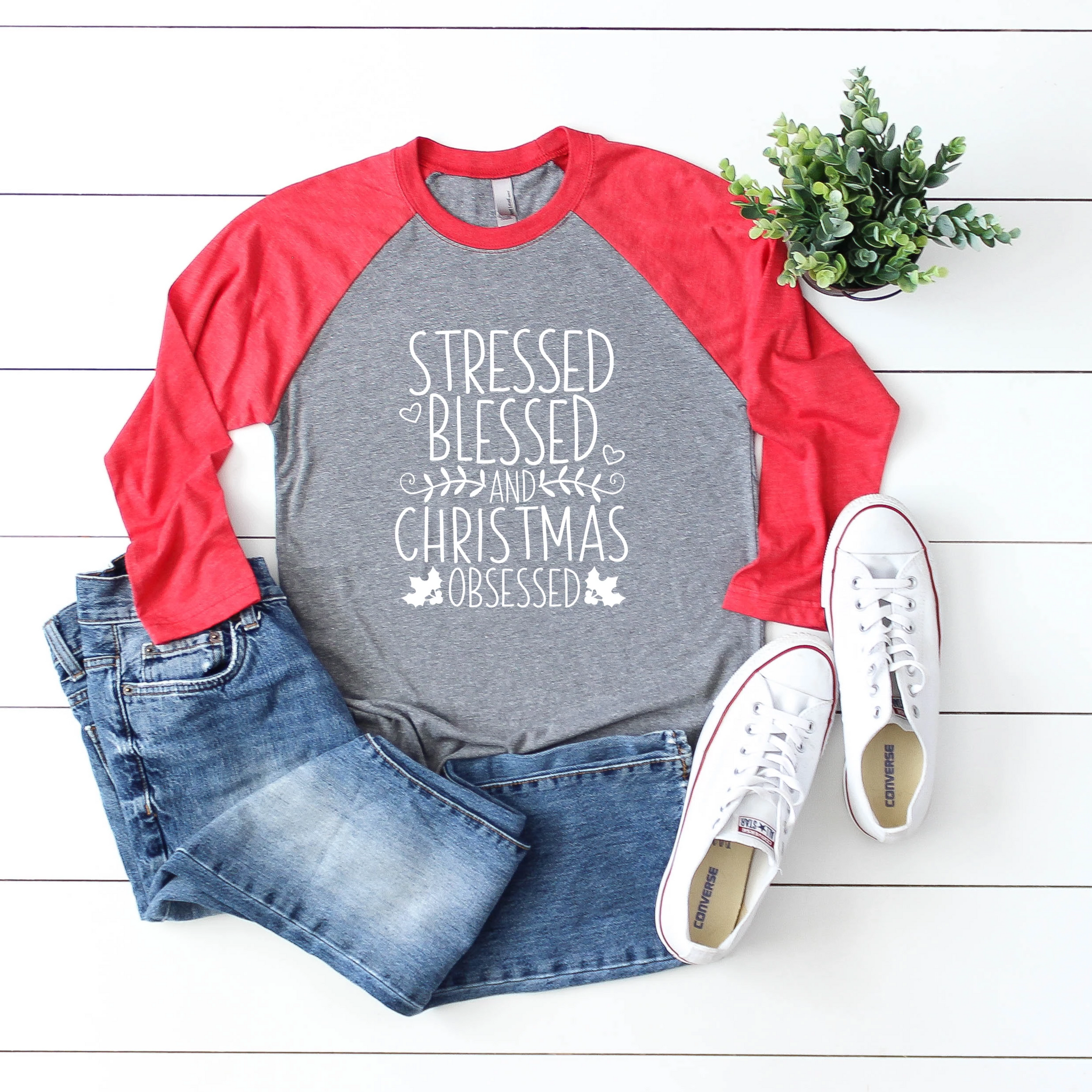 This super soft and comfy Next Level triblend raglan tee features 3/4 length sleeves and the phrase "Stressed Blessed and Christmas Obsessed".
