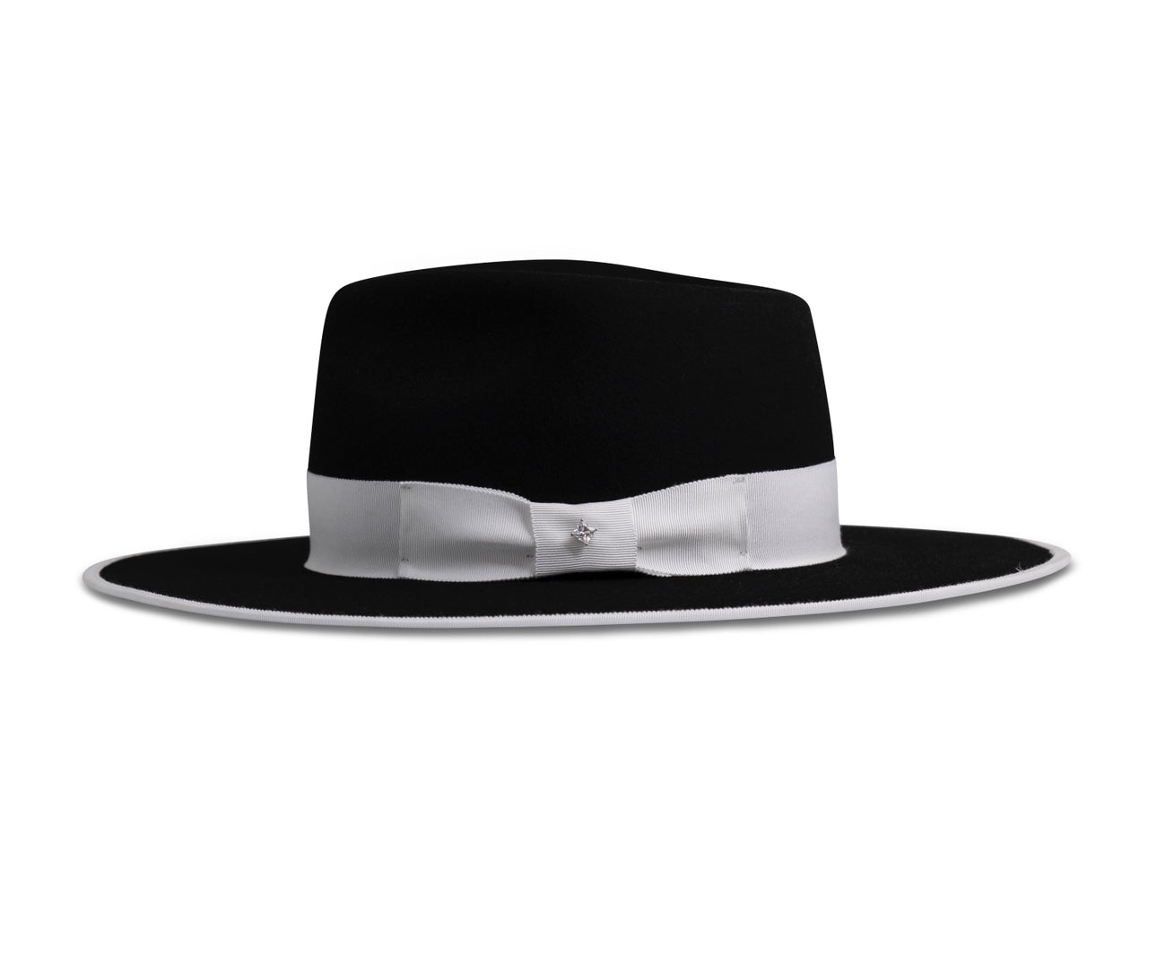 The Black Stud is made with 100% American rabbit felt, giving a soft texture and gorgeous sheen. The distinctive style is accented by a large, 4 3/4" teardrop crown and 3 1/2" flat brim. Regardless of the color options you choose, the Black Stud can be identified by the signature sparkling stud featured in the middle of the ribbon.
