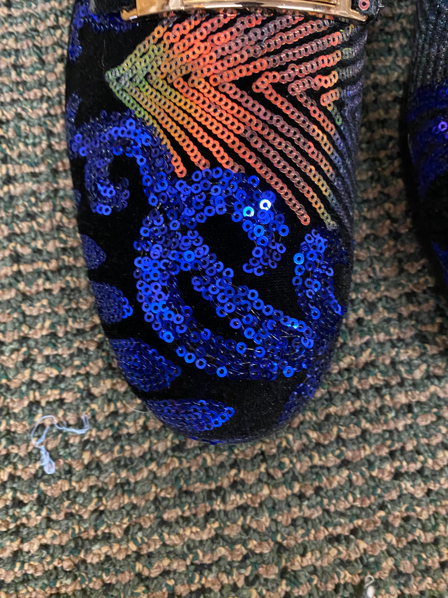 • Royal blue sequins in a floral print with rose gold/green sequins on a black suede-like backdrop