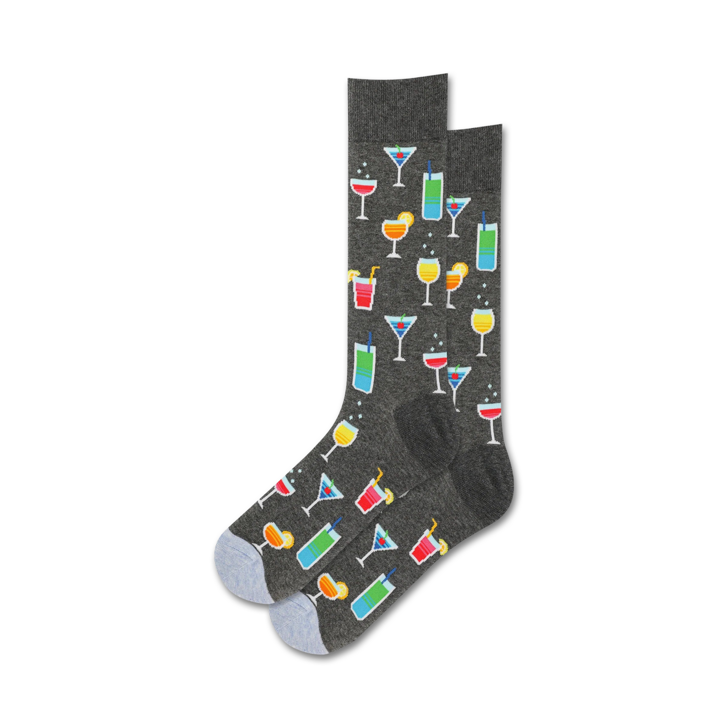 Turn heads while sipping your favorite drink with a pair of these Summer Cocktails crew socks. The dark gray background features a colorful pattern of cocktails in blue, yellow, orange, and green. Just like the real things, these cocktails are topped off with cherries, olives, and citrus wheels. The perfect choice for any party animal or cocktail enthusiast.