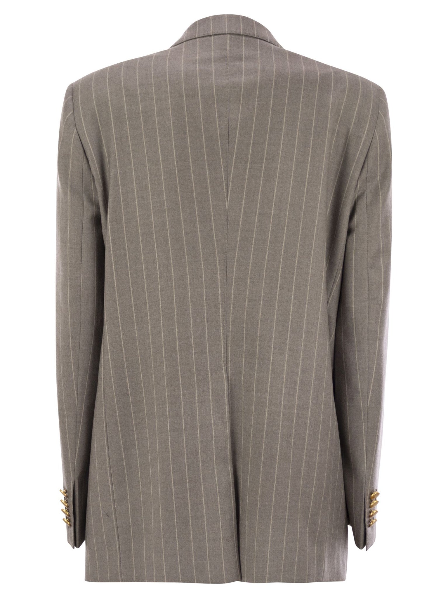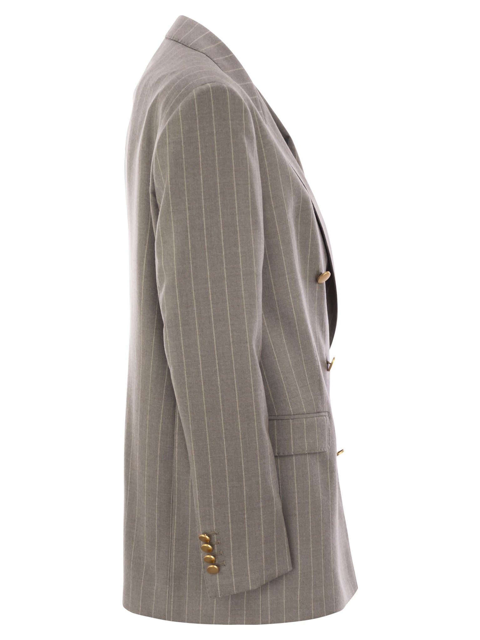 Make your wardrobe unique with elegant garments like this strestch wool blazer from the Tagliatore collection. A femininity that at times draws from the masculine, the usual attention to detail, starting with the precise choice of the double-breasted to the proportionate cuts of the jackets, this is the spirit of the maison. Made in Italy, it is a tailored double-breasted model with peaked lapels, flap pockets on the front and a pinstripe pattern. - Lance lapels - Low pockets - Regular fit - Double-breasted closure DESIGNER ID: JJASMINE10B150150R24I330 T1353