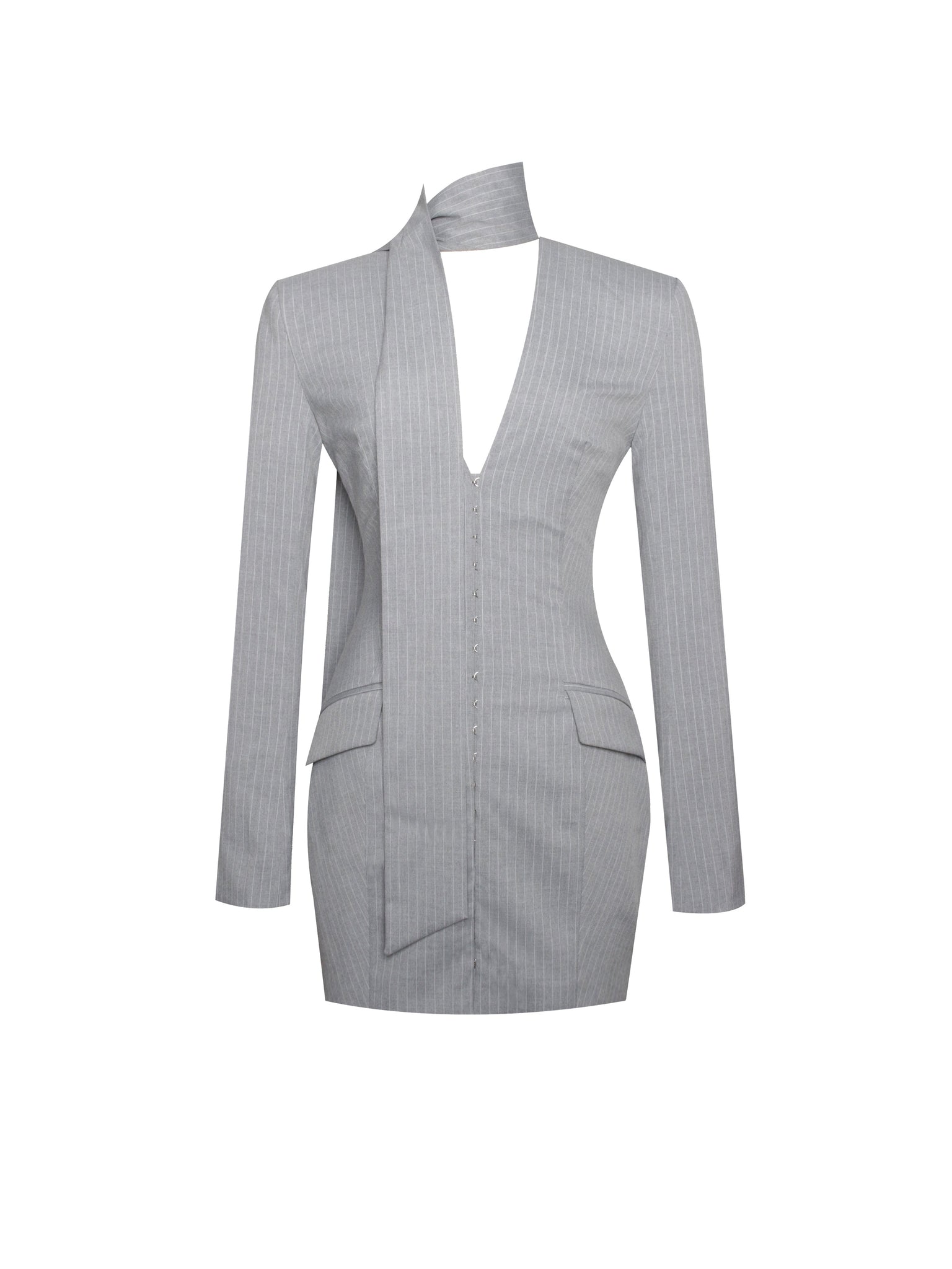 Introducing our Tahlia dress, a sophisticated blazer pencil dress in Gray with silver pinstripes. The long sleeves and deep V neckline paired with a scarf collar add a touch of refined elegance. The decorative flap pocket cap offers a chic detail, while the invisible button at the front ensures a seamless finish. Fully lined for added comfort, this dress combines classic tailoring with modern style, making it an impeccable choice for any formal occasion. Embrace its timeless allure and make a striking impression wherever you go. And it's also available in Navy Blue.