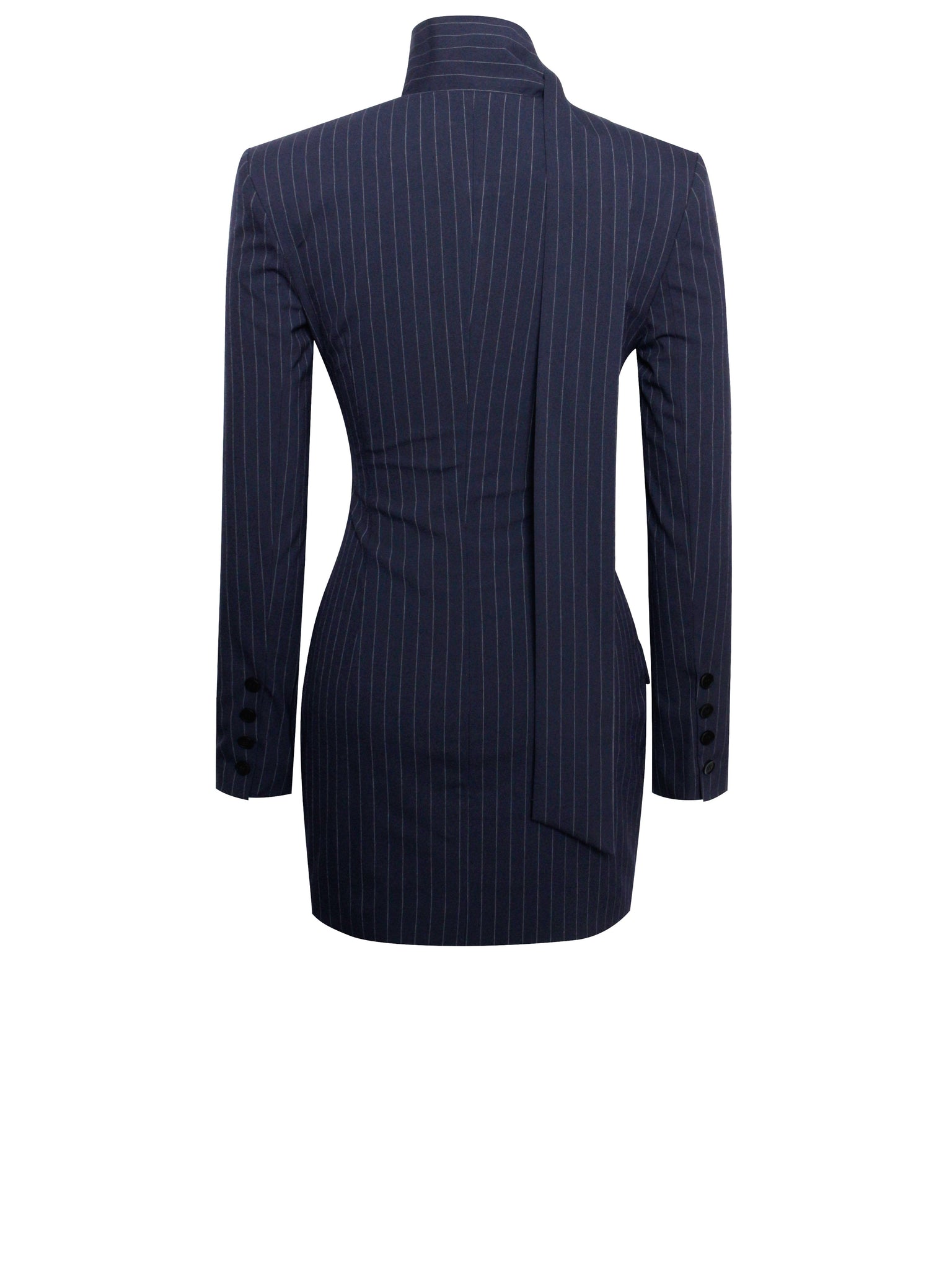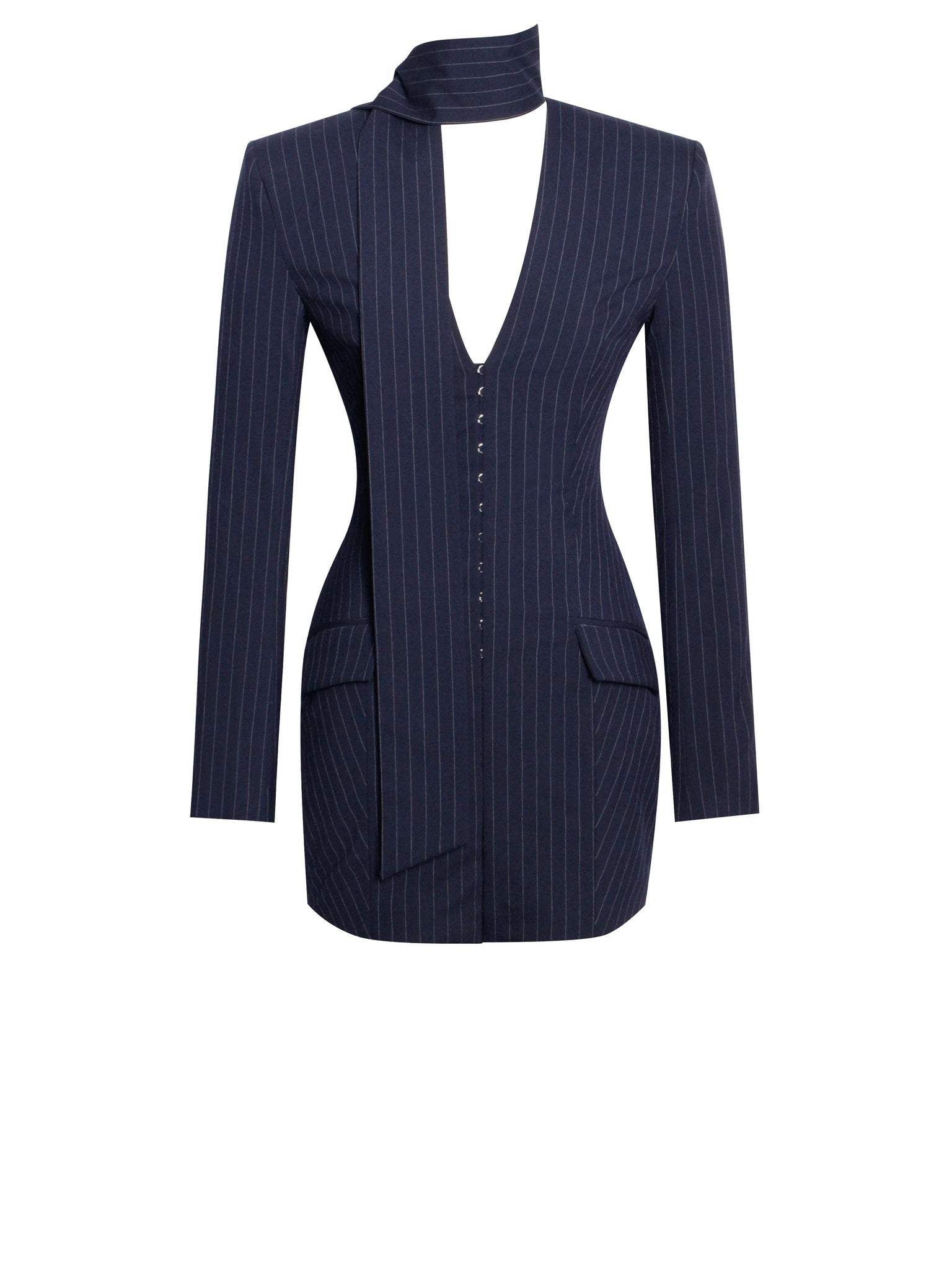 Introducing our Tahlia dress, a sophisticated blazer pencil dress in navy blue with silver pinstripes. The long sleeves and deep V neckline paired with a scarf collar add a touch of refined elegance. The decorative flap pocket cap offers a chic detail, while the invisible button at the front ensures a seamless finish. Fully lined for added comfort, this dress combines classic tailoring with modern style, making it an impeccable choice for any formal occasion. Embrace its timeless allure and make a striking impression wherever you go.