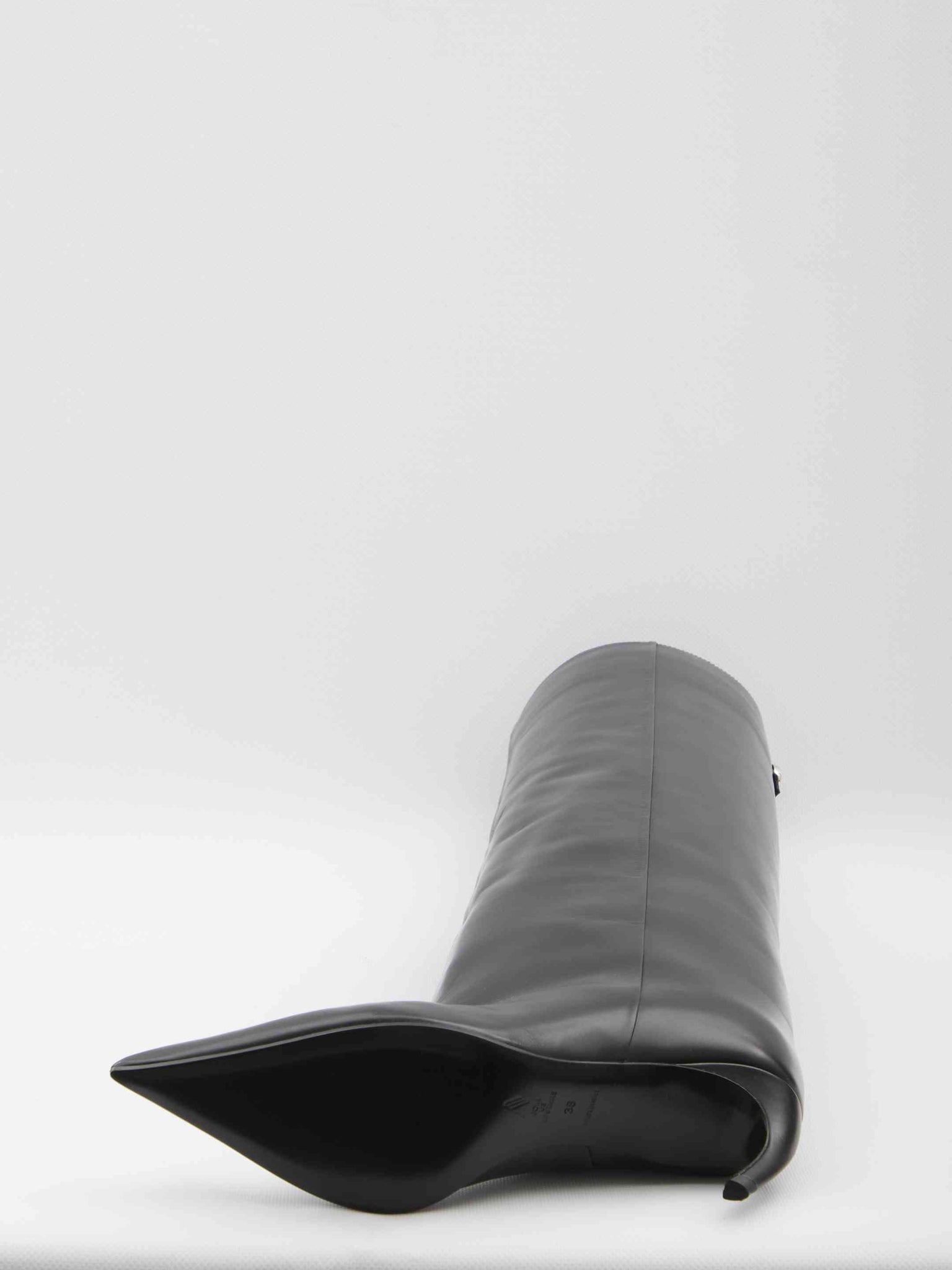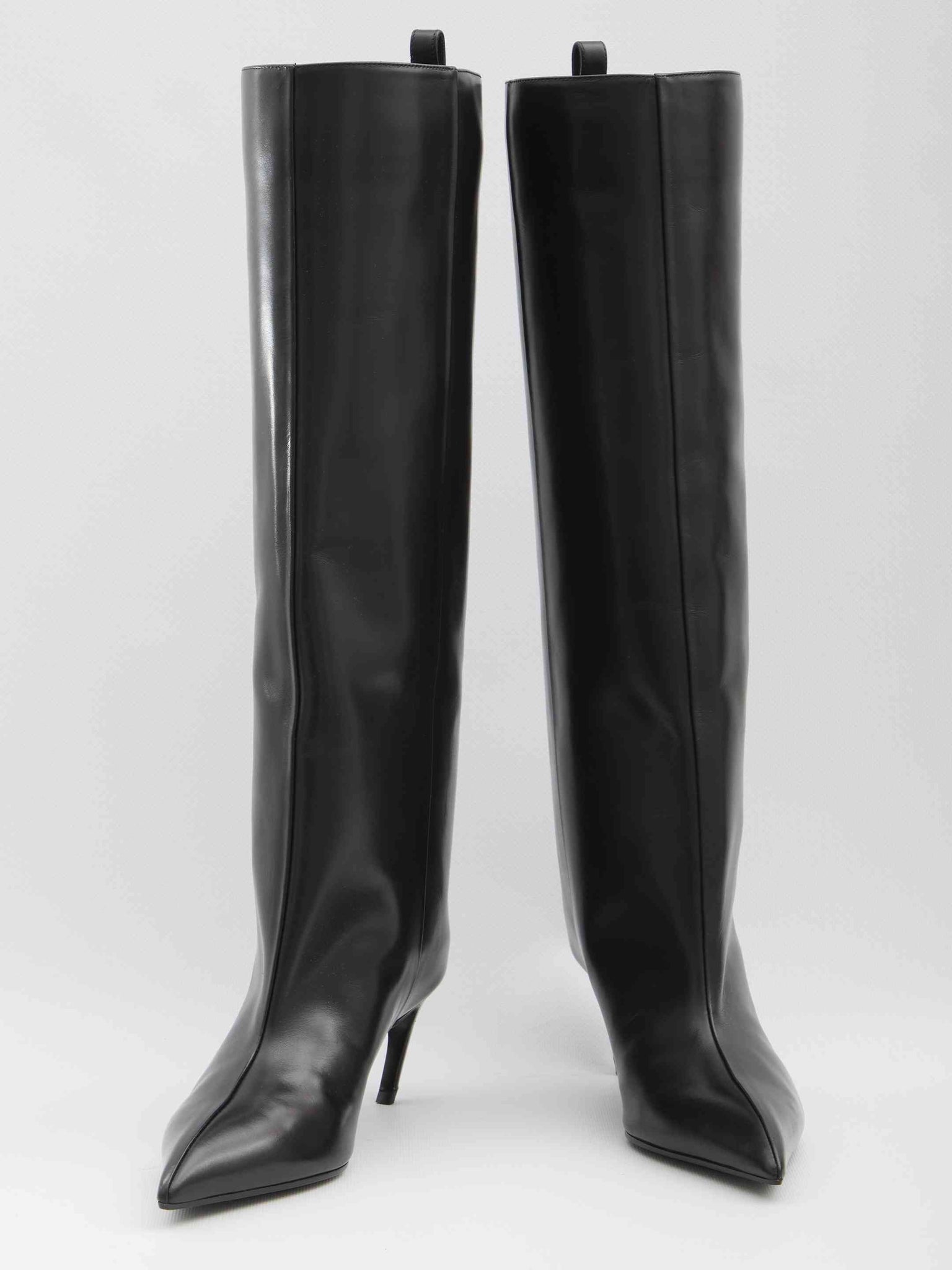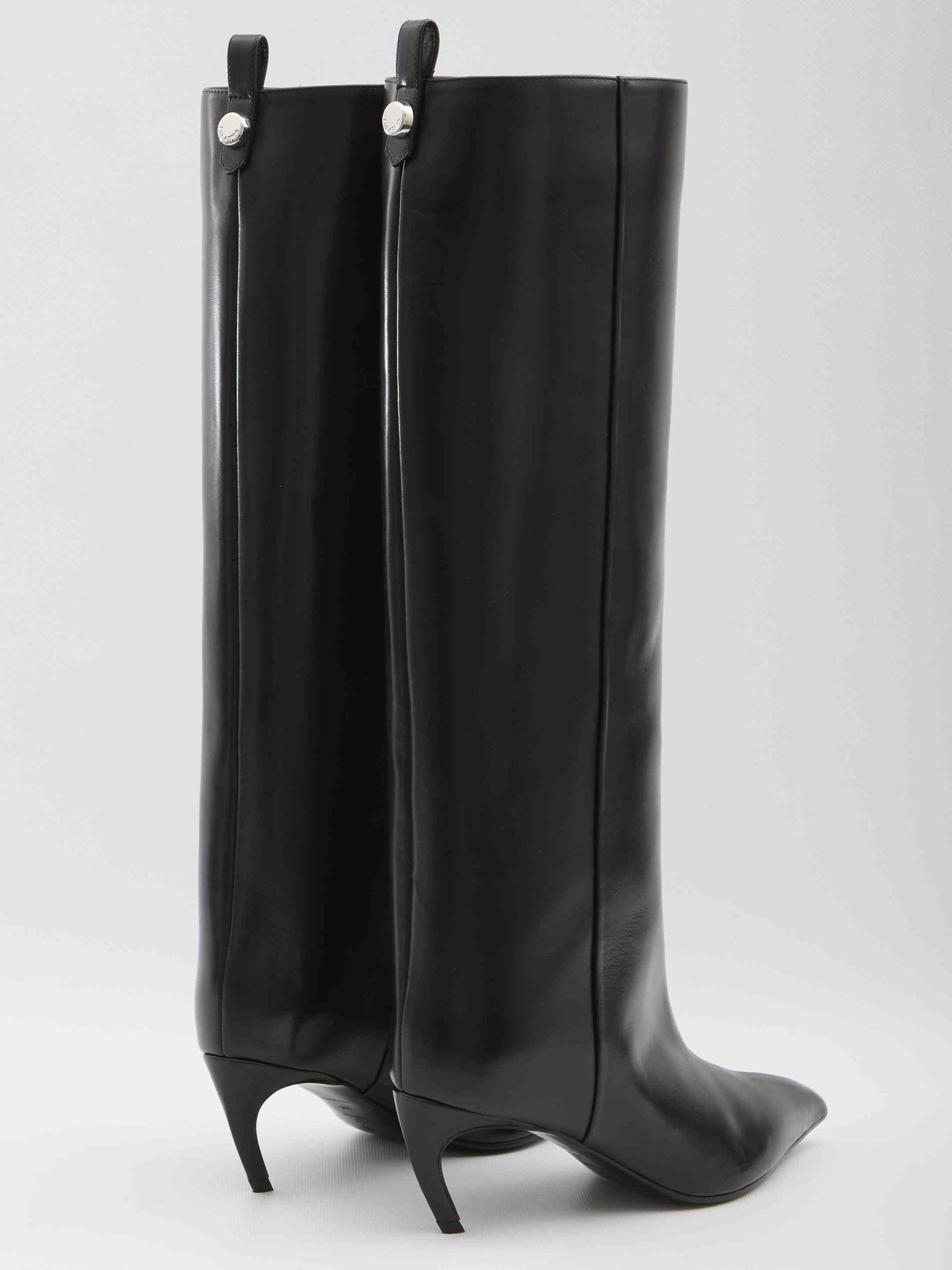 Boot in black calf leather. Features a pointed design, slightly curved heel, pull-on detail and button on the back. Dust bag included.Any leather imperfections are not to be considered manufacturing defects, but rather a unique characteristic of the material.
