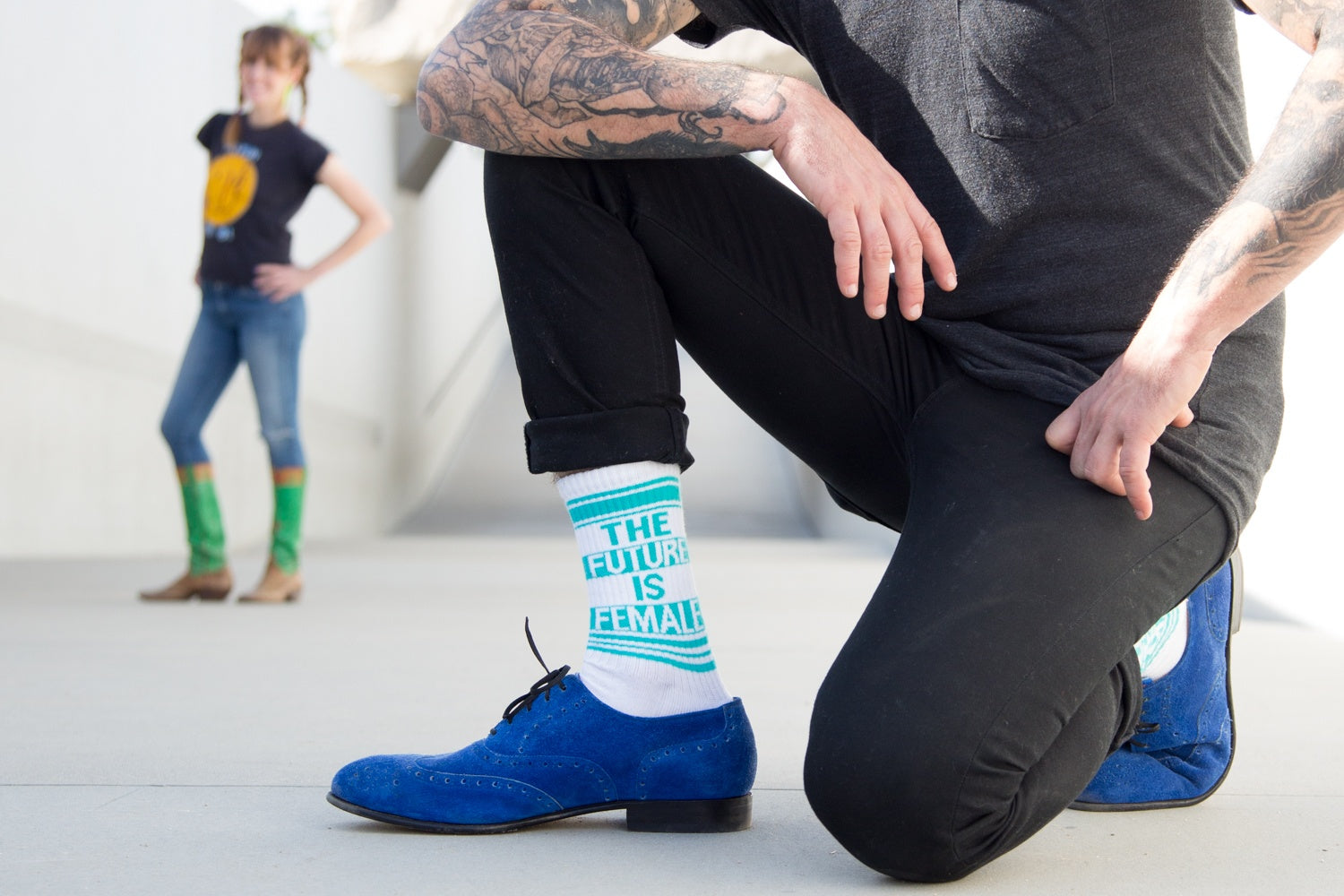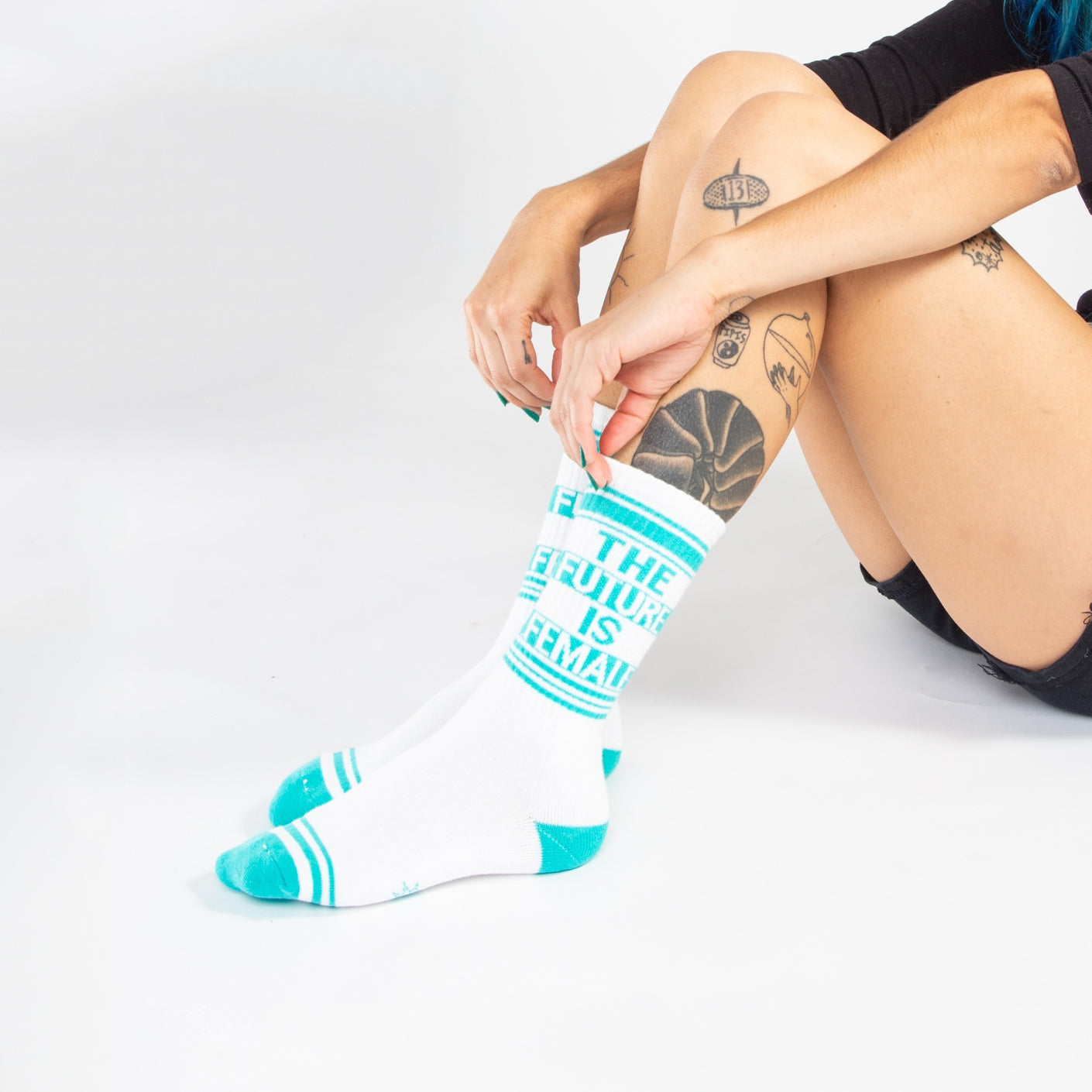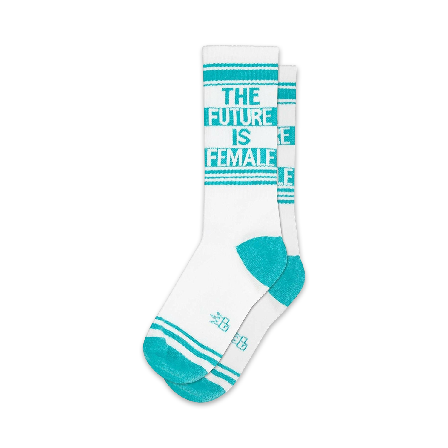 Looking for the perfect socks to wear for International Women's Day on March 8? Slip into a pair of these awesome women's novelty gym-style, ribbed crew socks! Each cool sock features the phrase "The Future is Female" along the sides against a white background.
