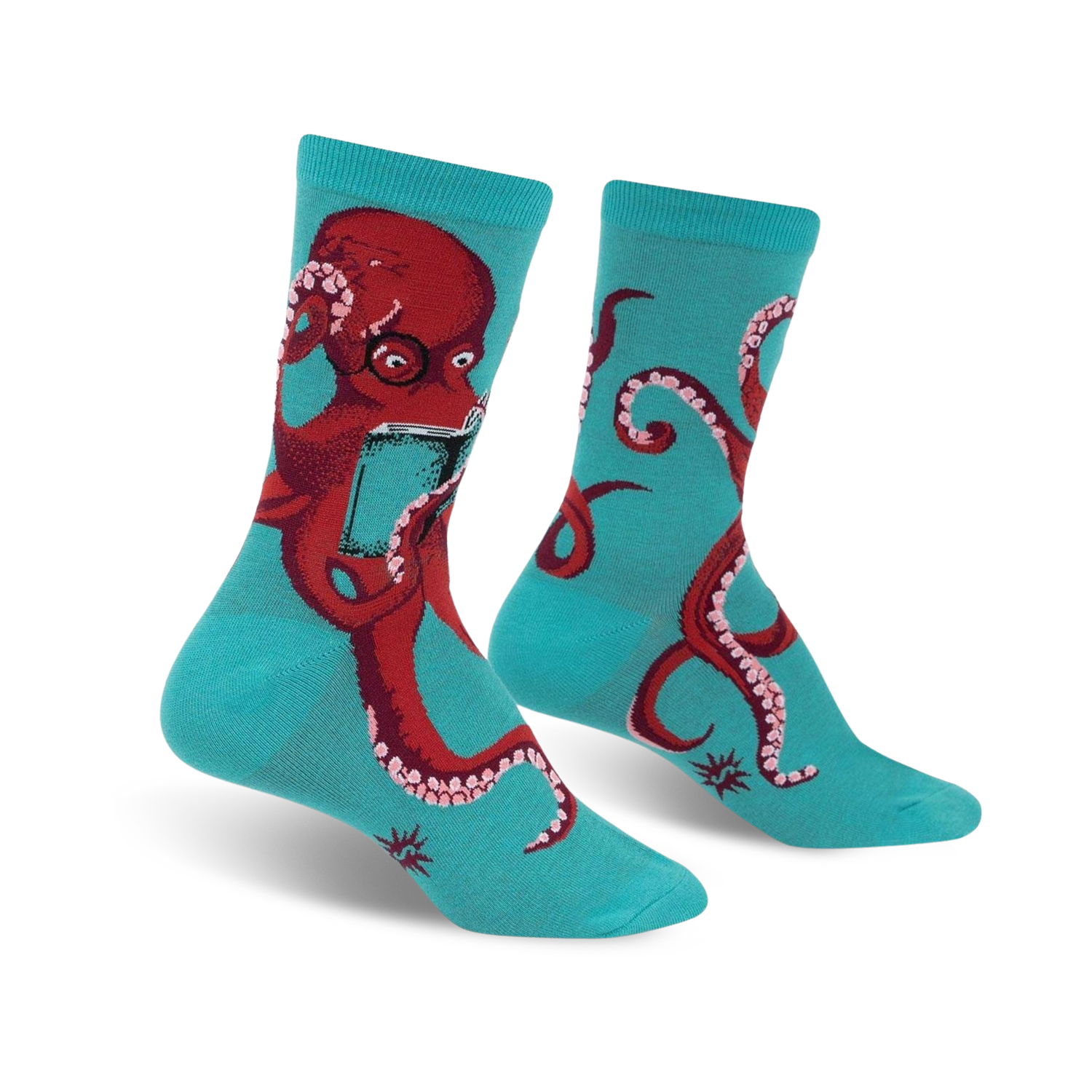 Octopuses got brains the size of peanuts but they're one of the most intelligent animals on earth. They love reading too. So, when your book club meets, read The Octive Reader. These turquoise socks feature bright red octopuses wearing glasses and reading books. They're made for women and come in crew length. You'll love them almost as much as octopuses love books!