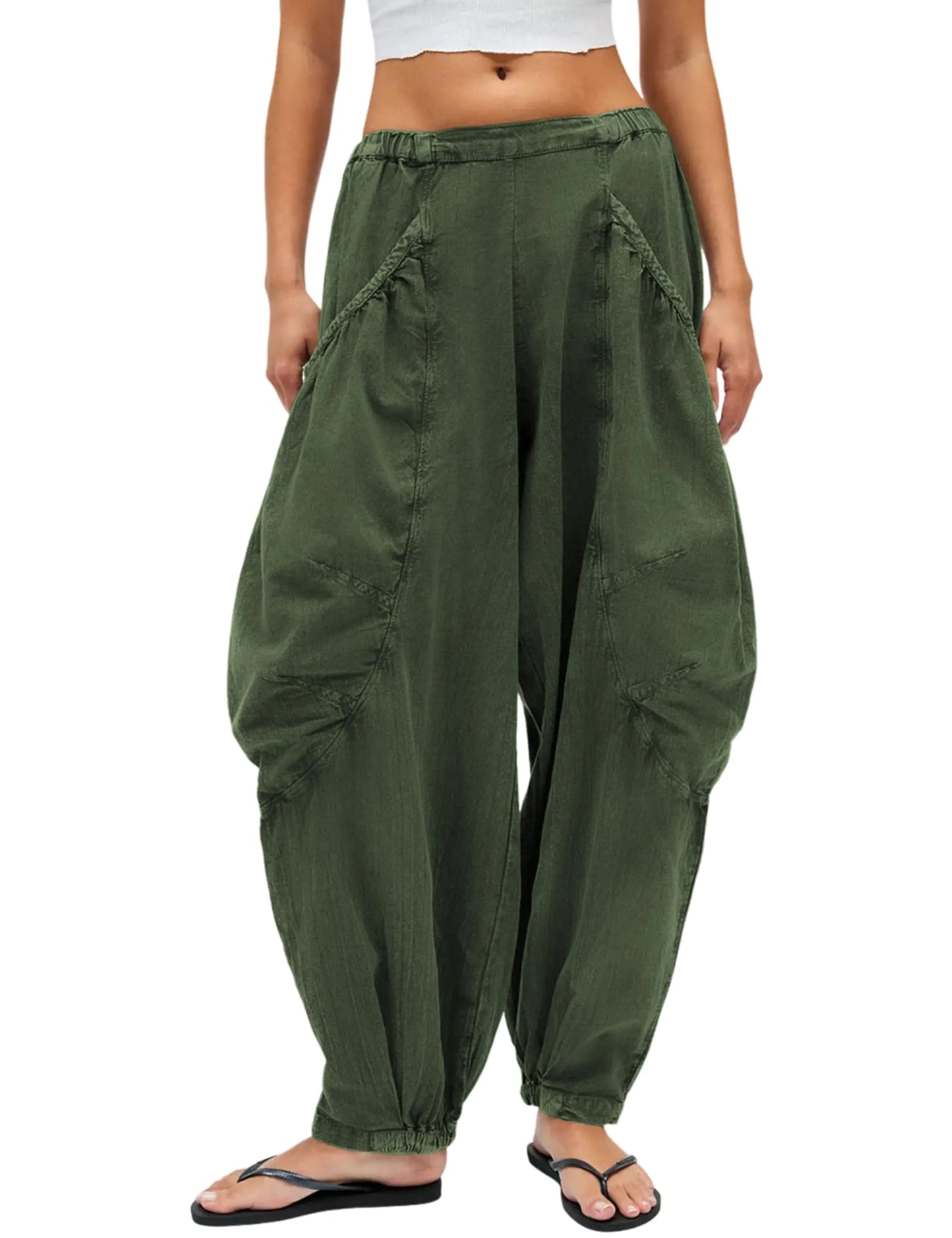 Loose fit harem pants with a low waist design elastic waistband and leg cuffs side pockets fashionable and versatile.