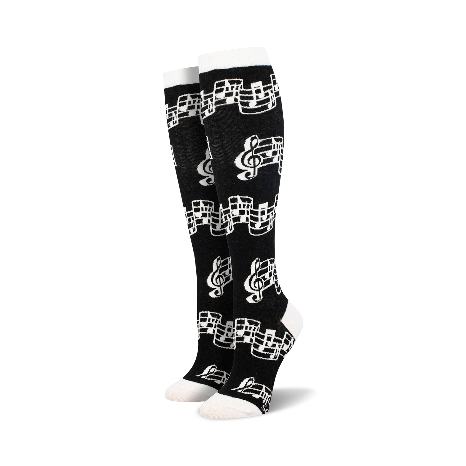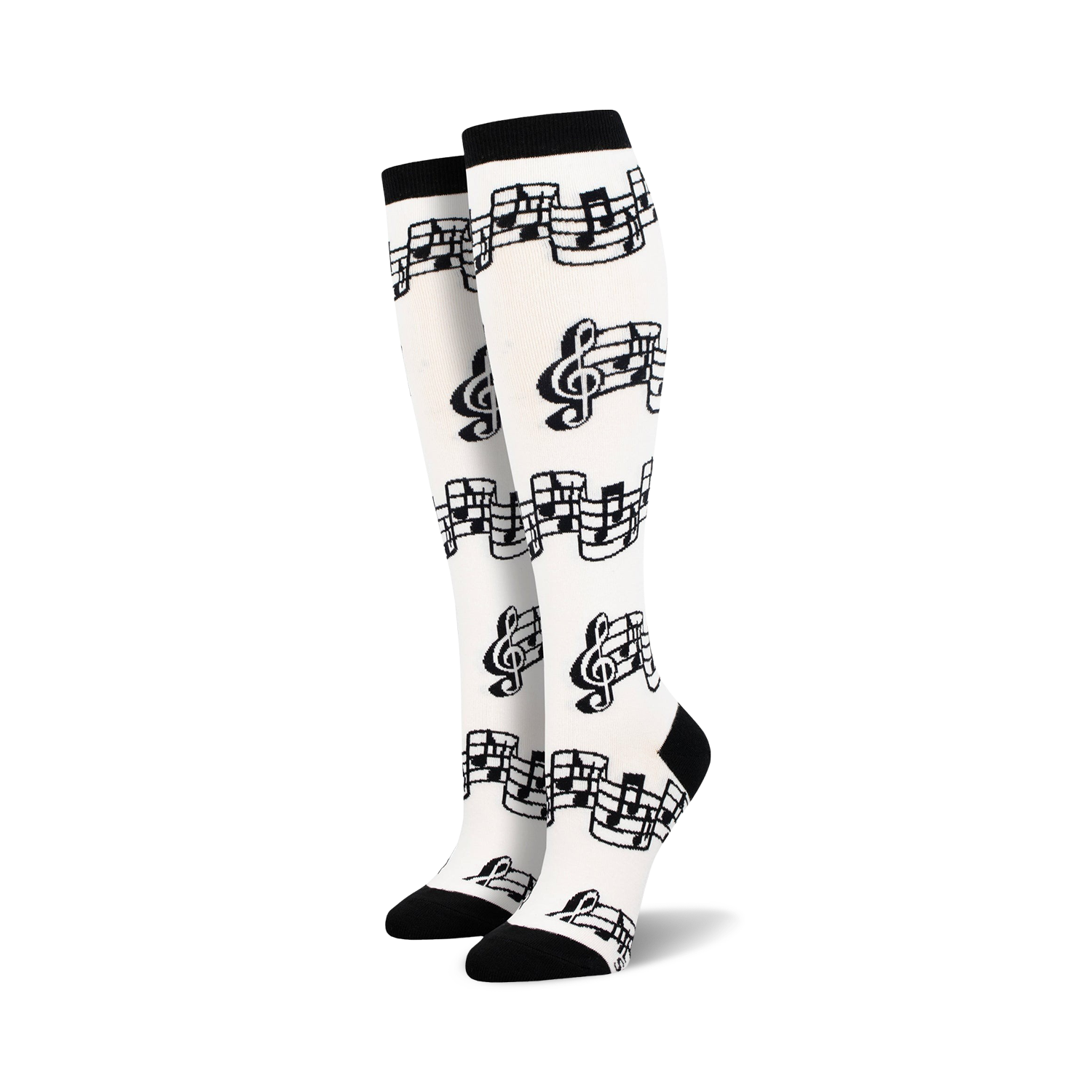 It's time to kick your music-themed wardrobe up a notch! This pair of Knee High Womens Tuning Out Music Notes novelty dress Socks has black treble clefs and eighth notes printed on a white background, and they're made with an eye-catching design you won't find anywhere else. These super-fun, comfy, and cool Knee High Womens Tuning Out Music Notes novelty dress Socks will be the perfect additions to your drawer. Our novelty dress Socks are designed with a soft feel that you will absolutely love. These Knee High Womens Tuning Out Music Notes novelty dress Socks are made entirely of a high-quality fabric that provides the perfect amount of coverage without being too thick or too thin. Wear our Knee High Womens Tuning Out Music Notes novelty dress Socks on a night out on the town or a casual day at home. Get your pair today while they're still in stock!