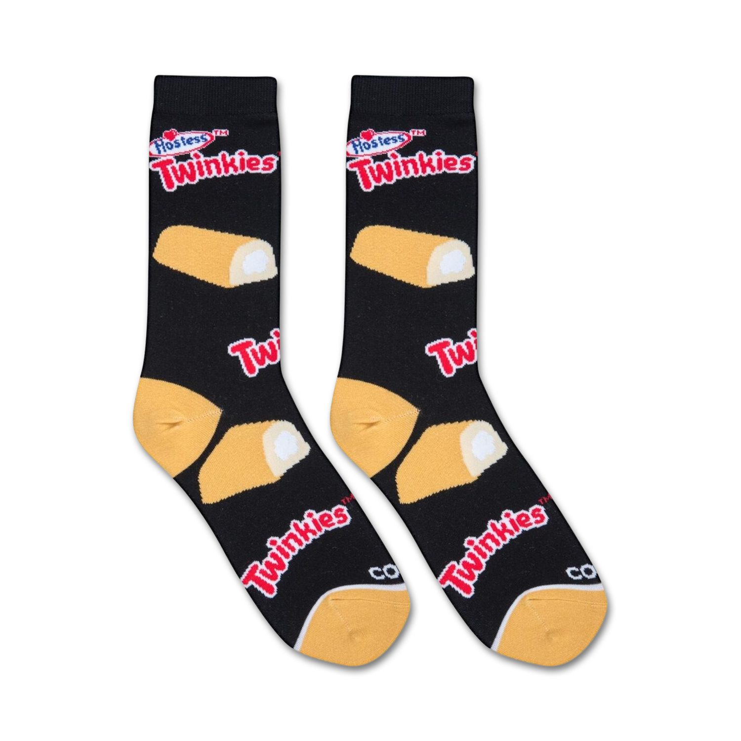 Here you go: Twinkies: Do you remember when your mom would pack your school lunch with a Twinkie? Of course you do! Now relive that nostalgic sugar rush with these fun crew length socks! Featuring an allover pattern of Hostess Twinkies, the famous yellow sponge cake with a creamy filling, these black socks will make you feel like a little kid again. Oh and BTW, they come in women's sizes.