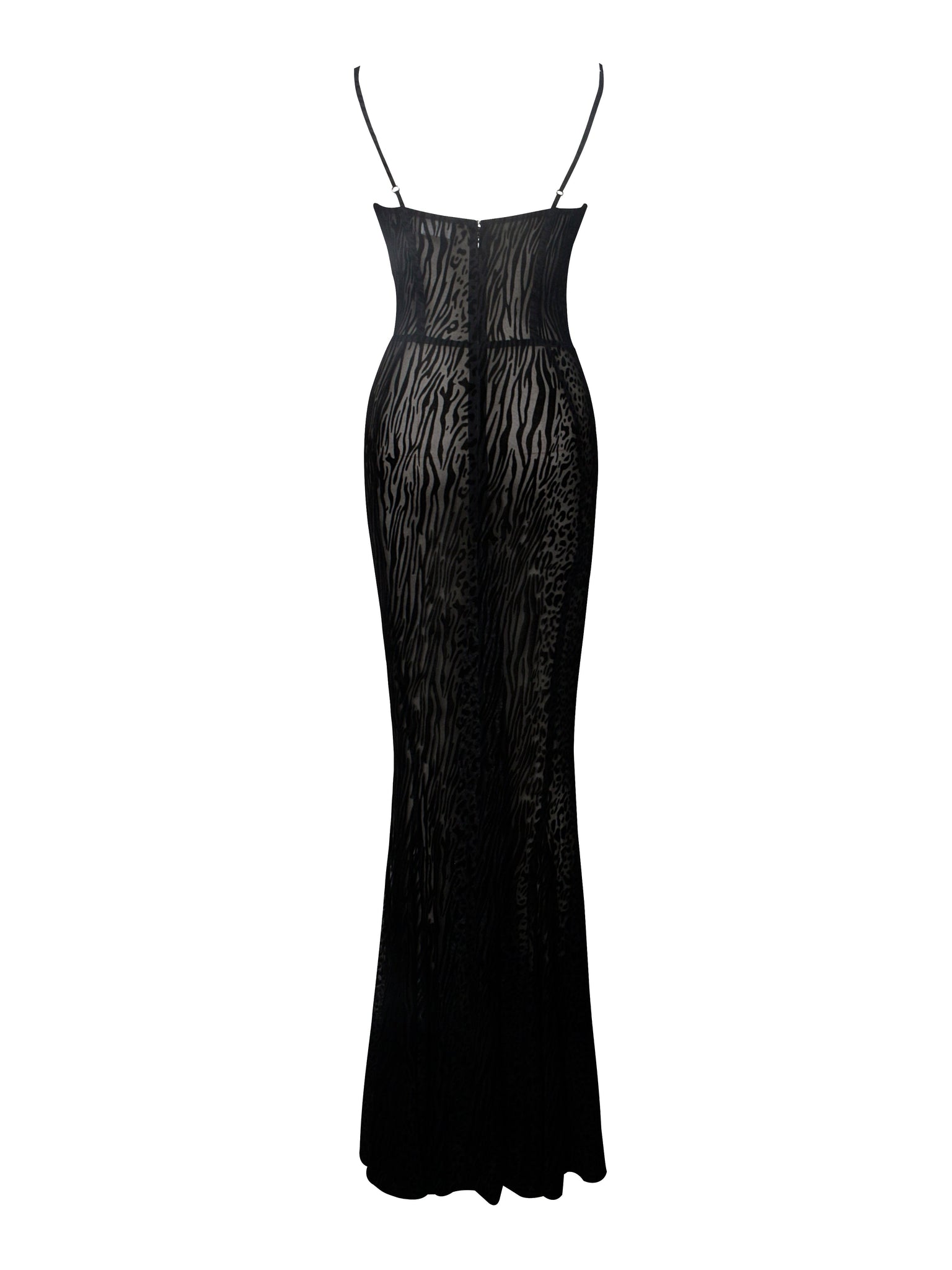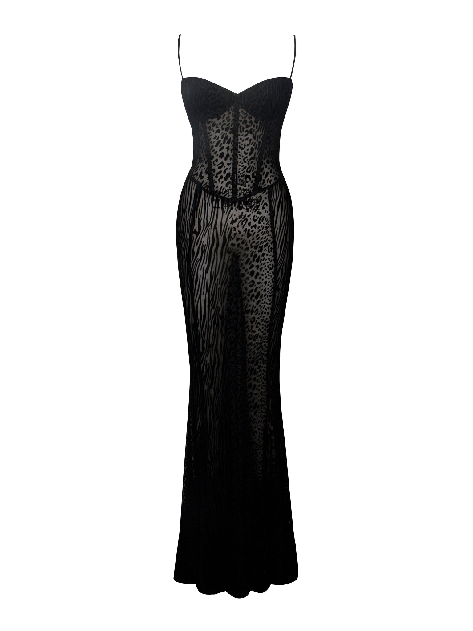 Say hello to our newest favorite, Ulani, a velvet burnout cheetah print maxi dress that combines allure with sophistication. The fully boned corset at the bodice accentuates your curves with its “V” shaped waistline. This design also features ruched cups with a mesh lining on the inside and adjustable thin straps for a perfect fit. Crafted from high-stretch velvet burnout mesh, its semi-sheer allure is perfect for a night out, birthday party, vacation, or any special occasion. The invisible zipper down the center back ensures a seamless look. Choose between classic black or luxurious gold to make a bold statement. Elevate your style with this extra-flared mermaid silhouette masterpiece!