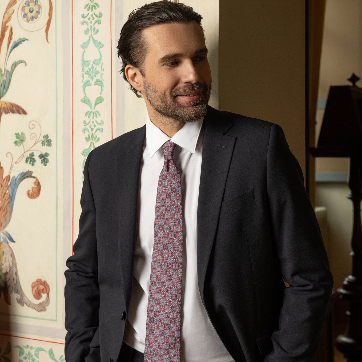 Introducing our Veneto Tie, inspired by the enchanting region where Venice is the crown jewel. This exquisite pattern in shades of red with a touch of ivory, blue and pink captures the area's rich artistic heritage and romantic charm, adding a touch of sophisticated elegance to your look. Perfect for the man who appreciates the finer things in life, this tie is a statement of cultured style.