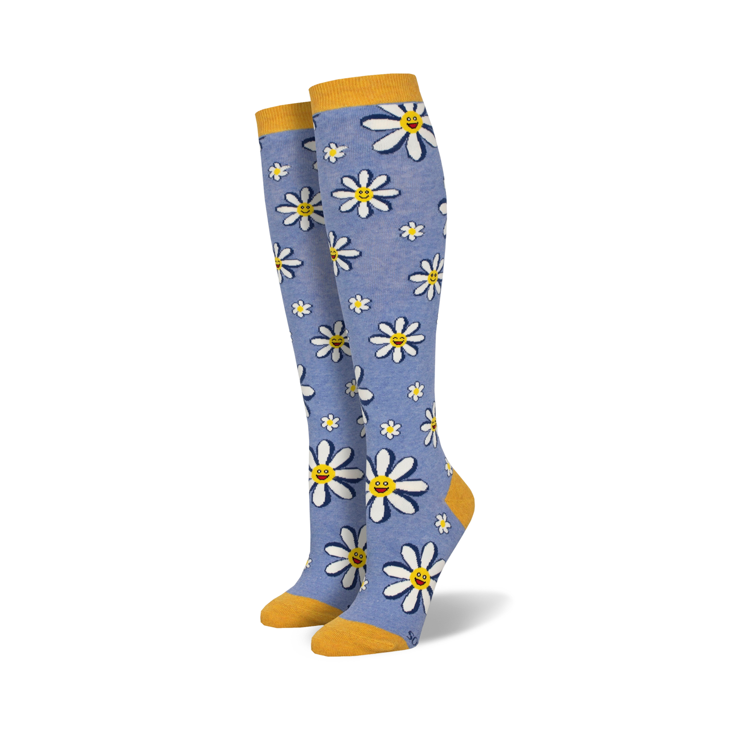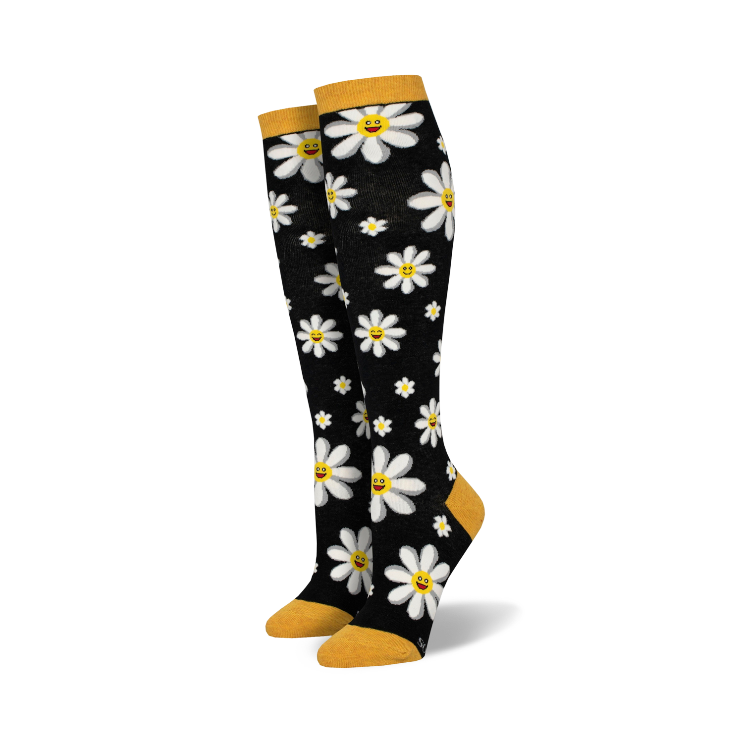 Whoopsy Daisy! These knee-high socks are a playful take on the classic daisy motif, with cartoonish white daisies blooming against a black background, each with a yellow center and a cheerful smiley face. The yellow cuffs and heels add a pop of color and fun, making these socks perfect for brightening up any outfit. With these Whoopsy Daisy socks on your feet, you'll be sure to spread smiles wherever you go!