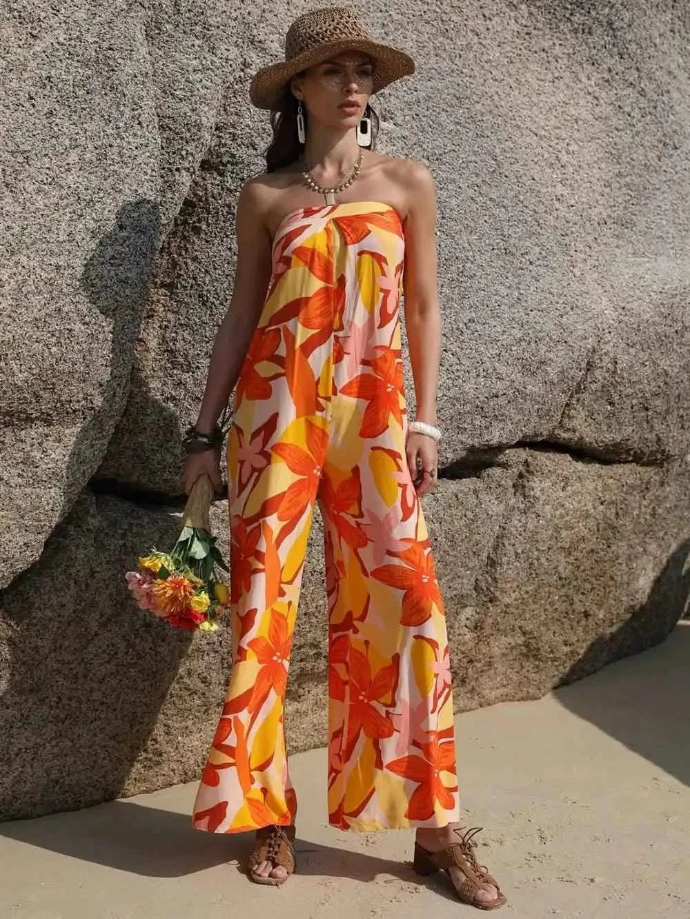 This versatile jumpsuit can be dressed up or down depending on the occasion. Pair it with heels and statement jewelry for a chic evening look, or style it with sneakers and a denim jacket for a more casual vibe. From brunches to date nights, this Tied Printed Tube: Wide Leg Jumpsuit will become a staple in your wardrobe for any event.