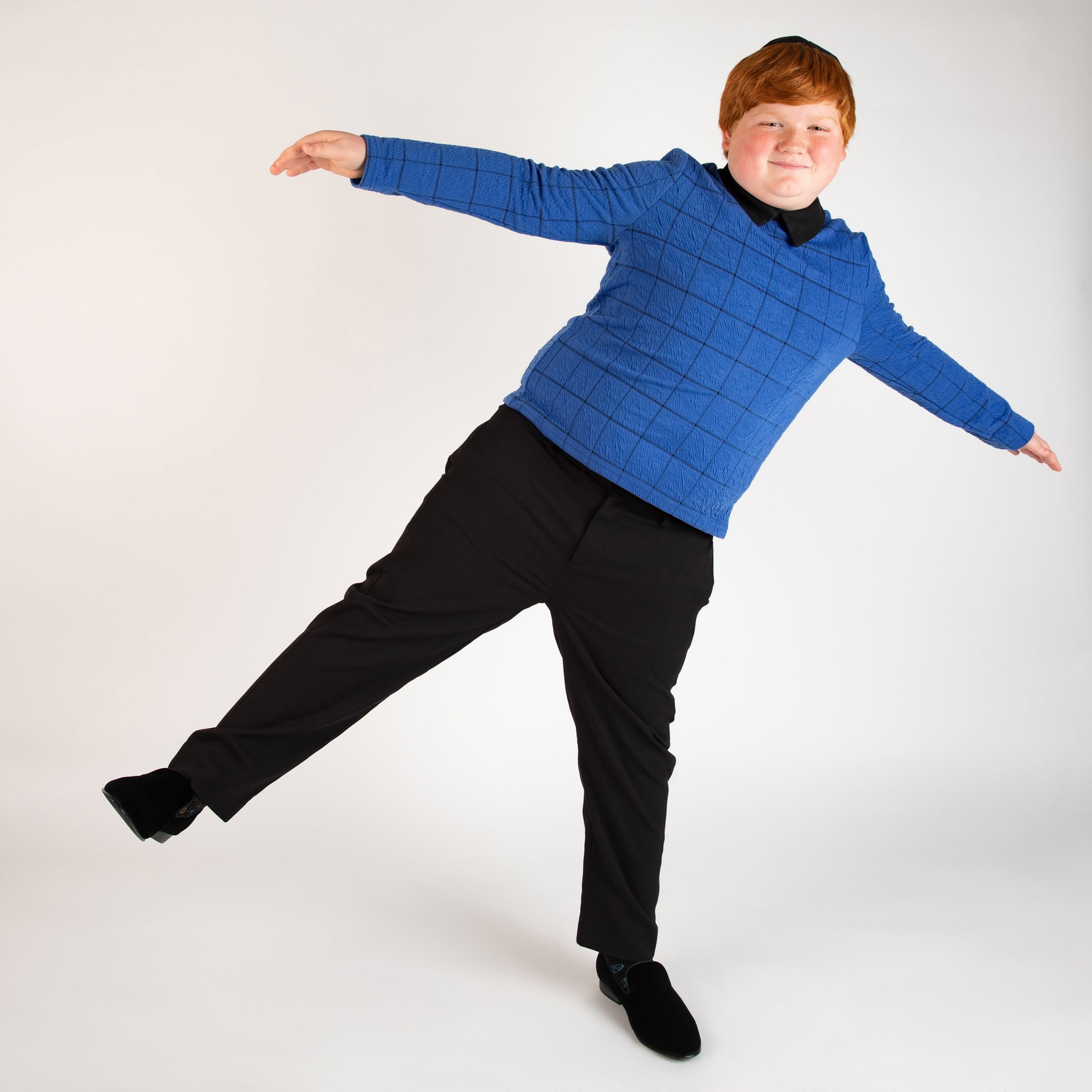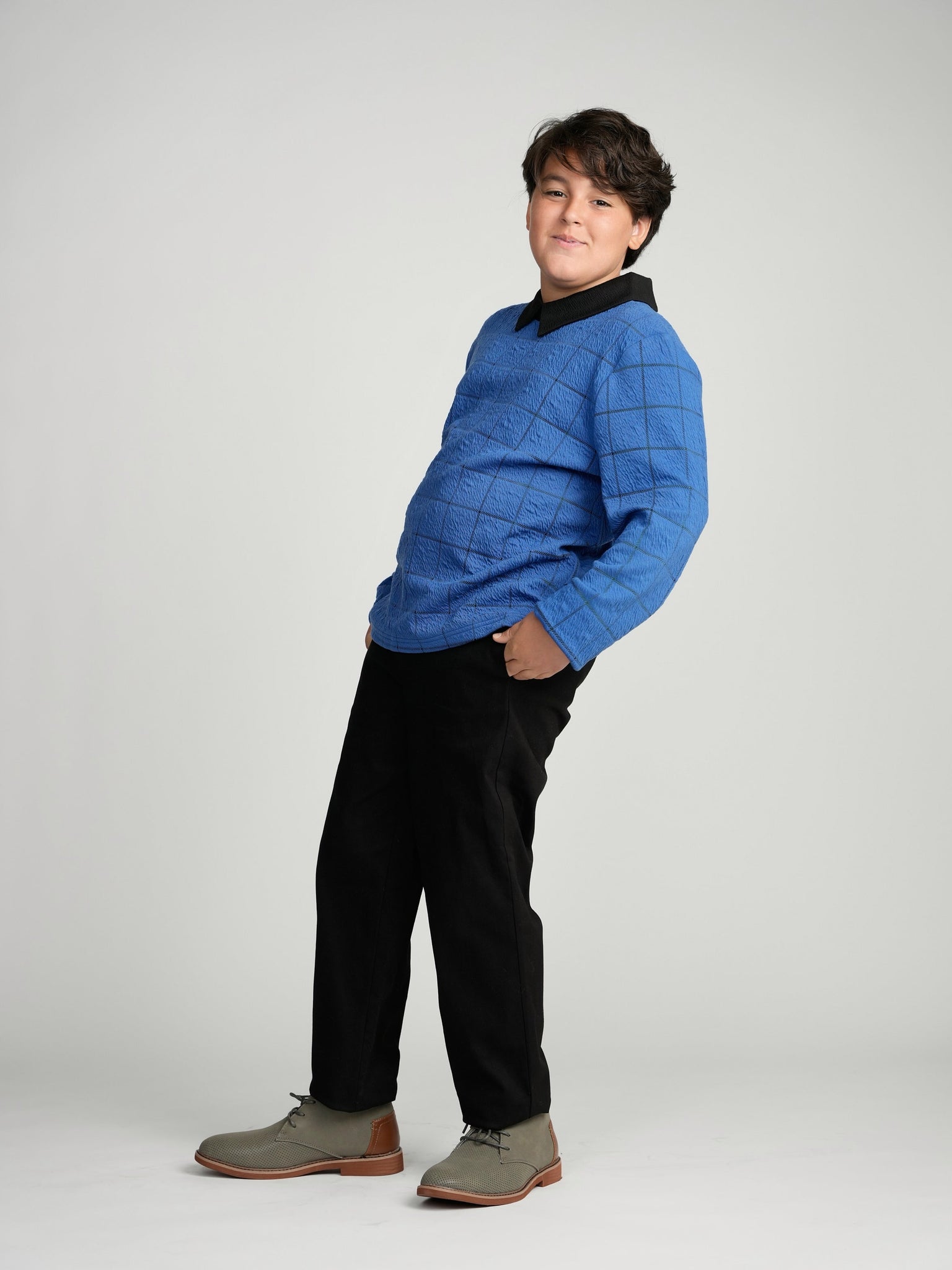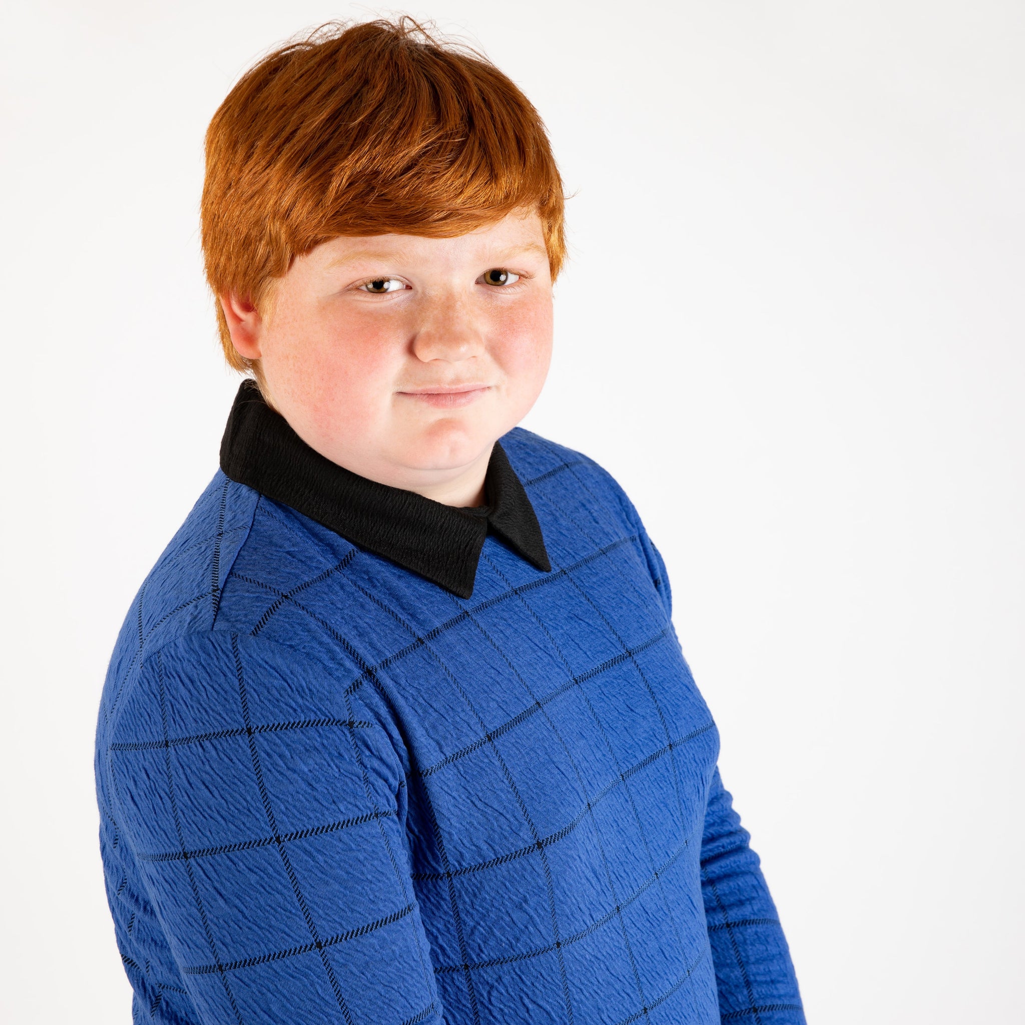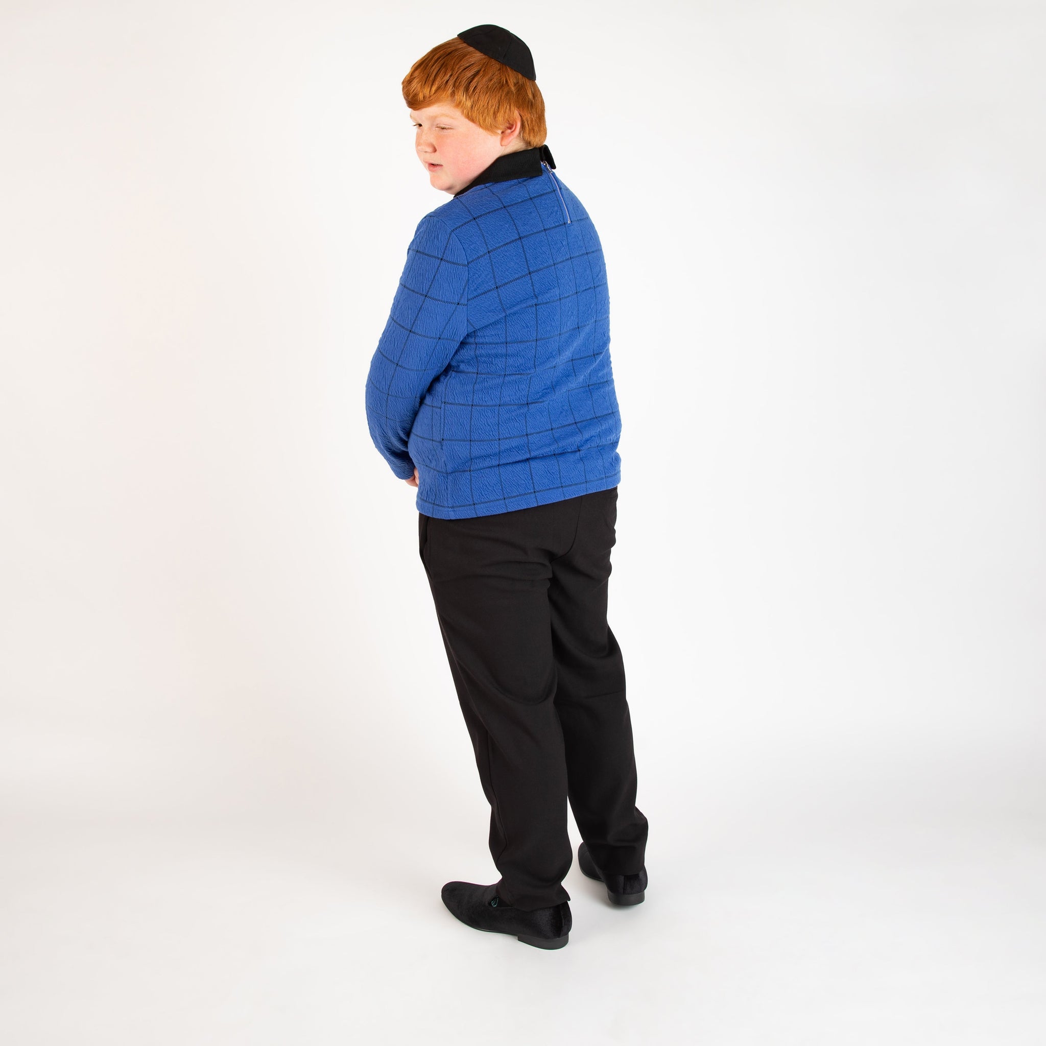 Our windowpane top is a beautiful cobalt blue windowpane pattern with a black collar and a small zipper closure in the back.