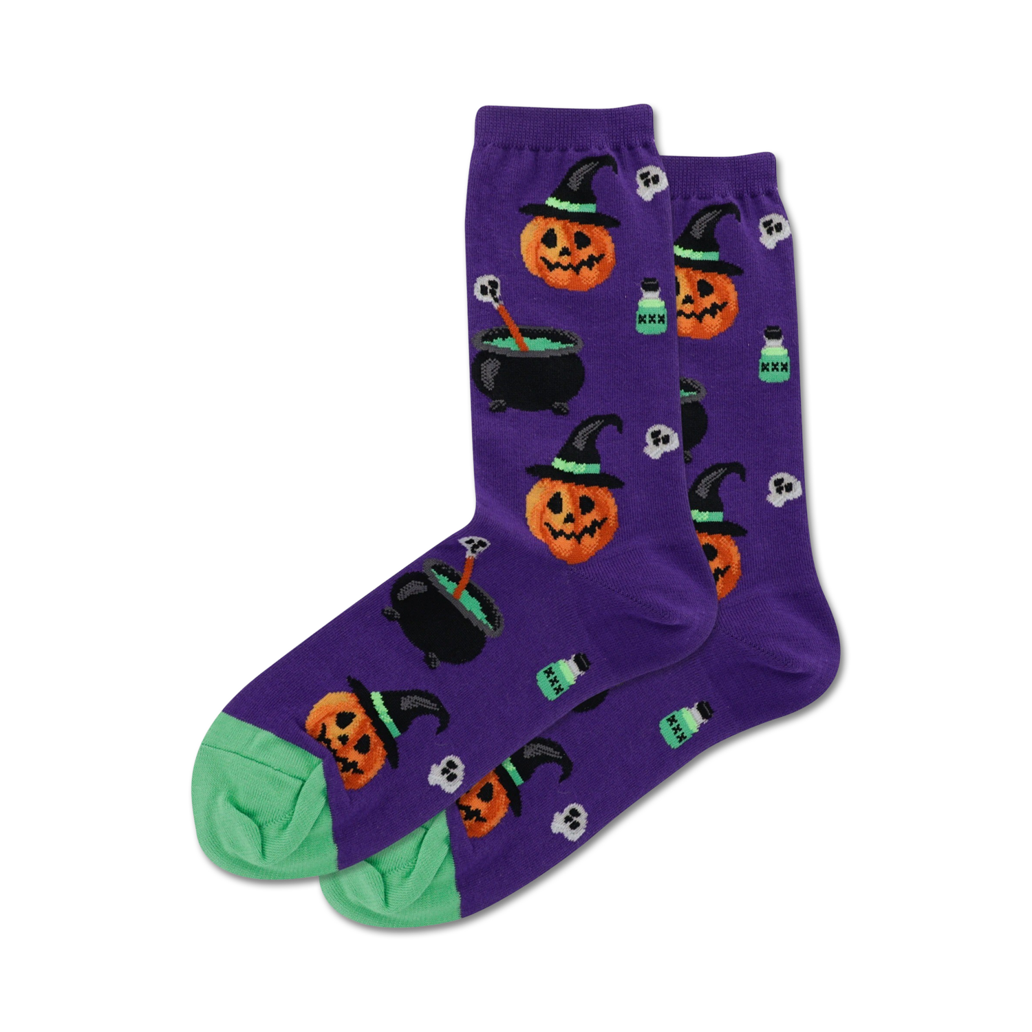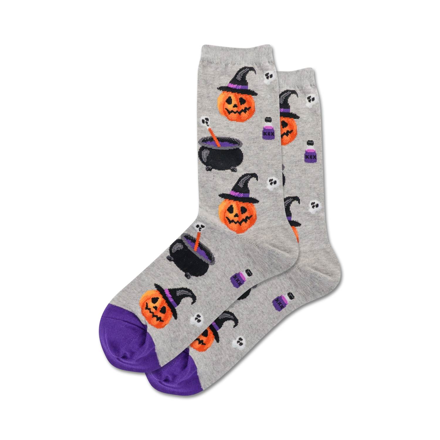 Halloween has never been so spooky and fashionably fierce than with these Witch Pumpkin socks! Experience a wickedly adorable design with vibrant pumpkins, witches' hats, purple stripes, and bubbling cauldrons on gray your feet will be downright spellbinding. Prepare to cast a hex on your sock drawer!