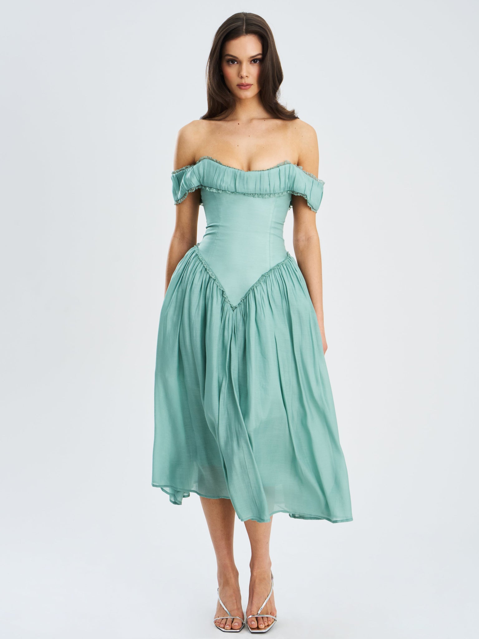 Embrace timeless elegance with the Xavy Dress in a striking teal green hue. This off-shoulder masterpiece features a delicately ruched neckline, enhanced by intricate lace trim for a romantic touch. The V-shape drop waist flatters the figure, while built-in bones and hidden tulle support sculpt the silhouette with grace. Fully lined with an invisible zipper and discreet side pockets, the Xavy Dress is both polished and practical—perfect for weddings, formal events, or any moment worth celebrating.