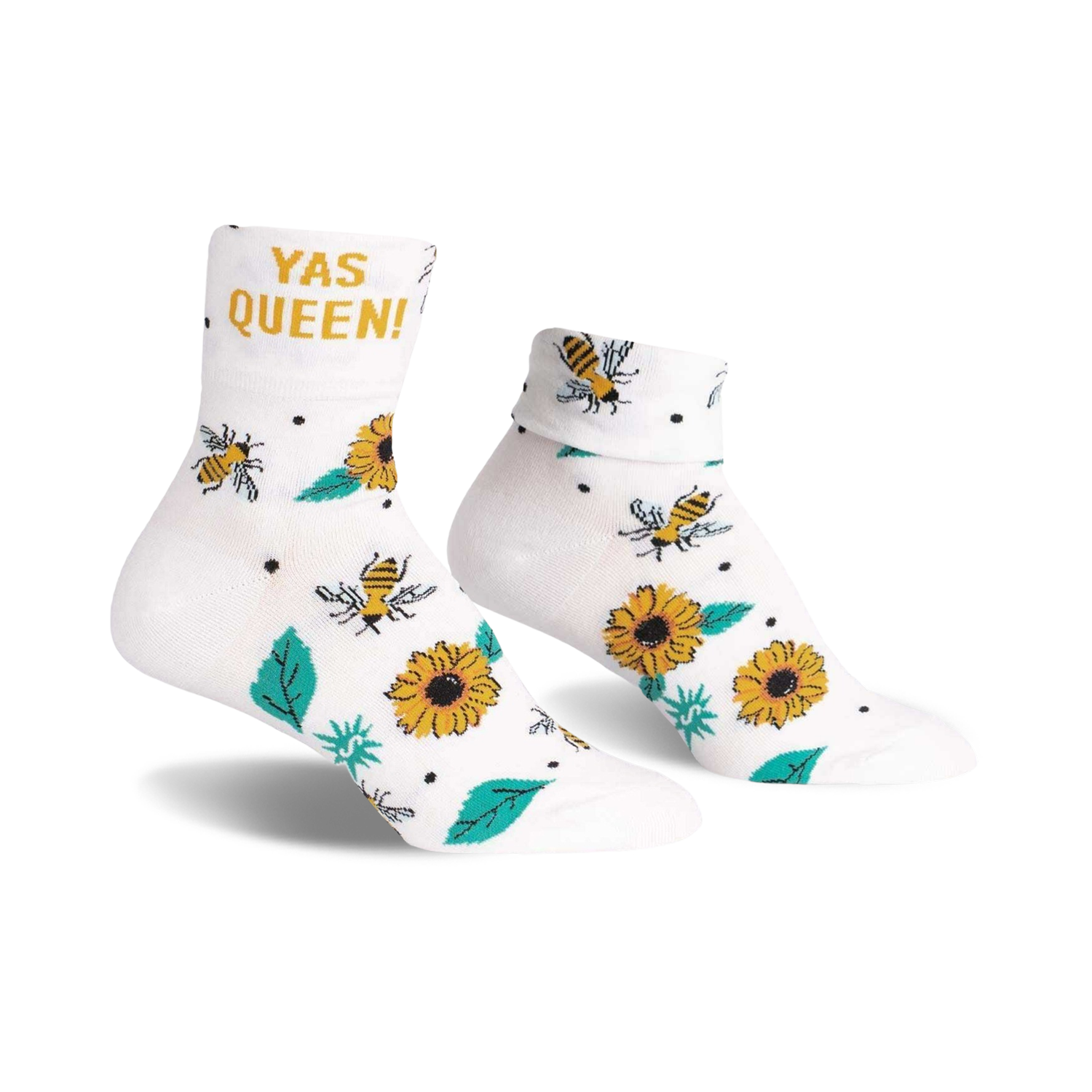 Strut your style and embrace your inner queen with our audacious "Yas Queen!" socks! These whimsical crew socks are adorned with a radiant pattern of sunflowers, jaunty bees, and lush leaves, infused with a burst of yellow letters that proclaim your regality. Slip into these playful socks and let your feet bask in the glory of nature's vibrant splendor.
