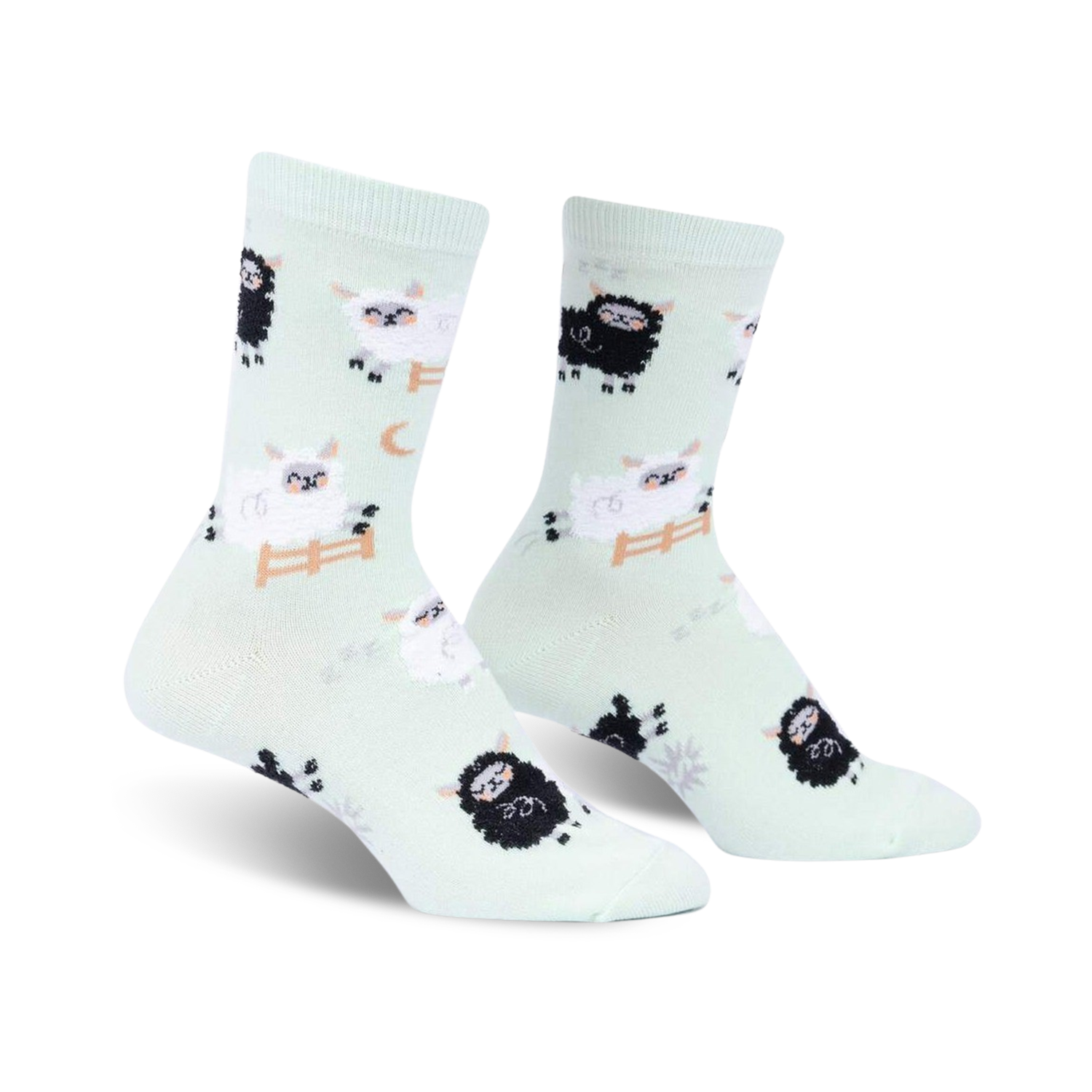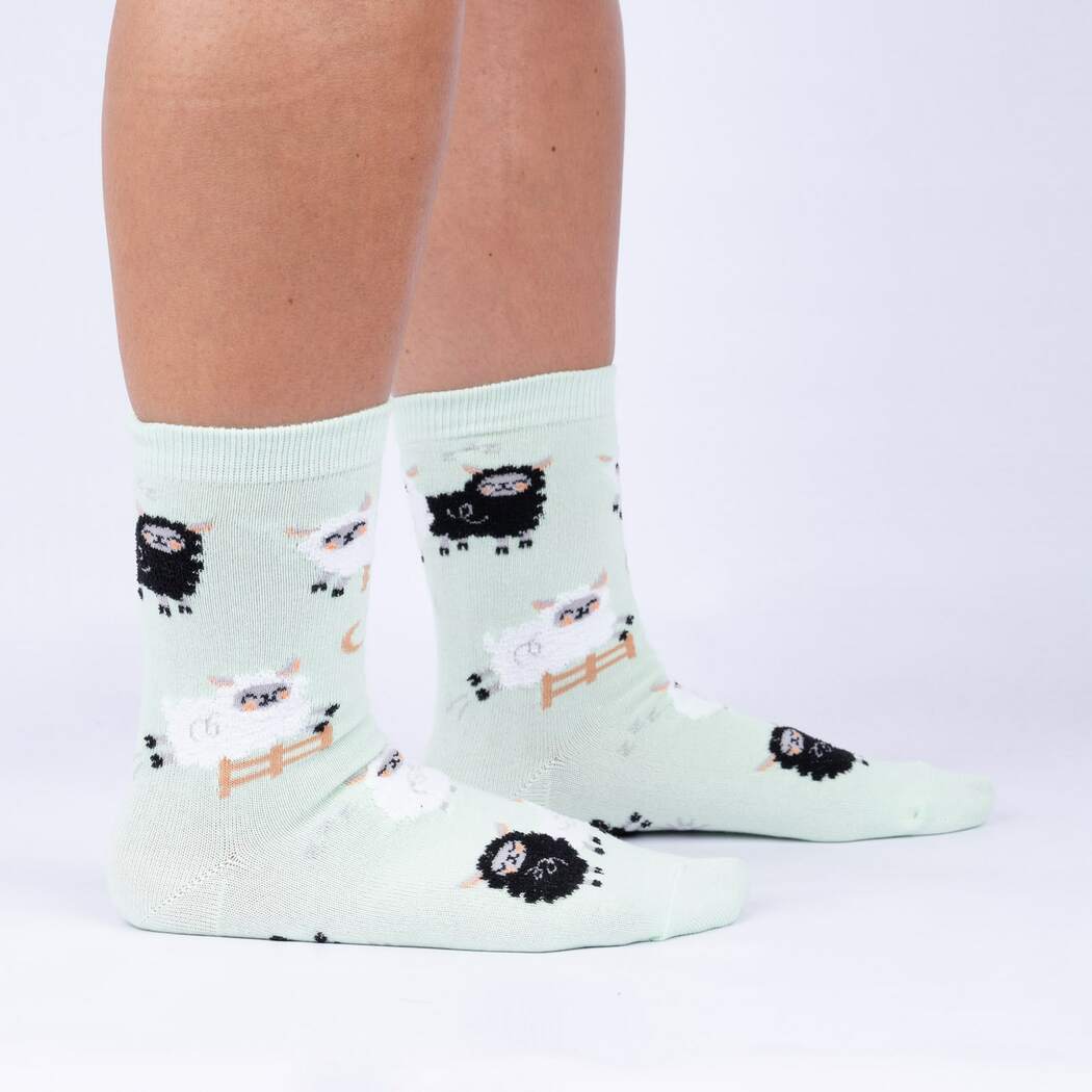 You Can Count on Me Socks: The mint green cotton stretches far beyond the realm of basic. This crew sock for women rocks a pattern stocked with black and white sheep wearing nightcaps. The moon shines down and a tiny white picket fence marks the border. These socks are ready to rest your feet in the sweet embrace of sleep.